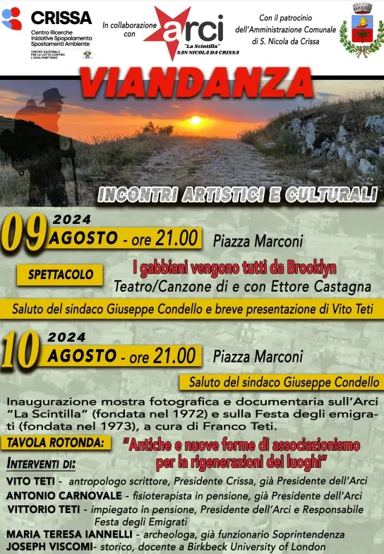 A San Nicola da Crissa tutto pronto per la “Viandanza”, incontri artistici e culturali in programma il 9 e 10 agosto. Il progetto è frutto del lavoro portato avanti da Crissa, Centro ricerche iniziative spopolamento, spostamenti, ambiente in sinergia con Arci e il patrocinio dell’amministrazione comunale.