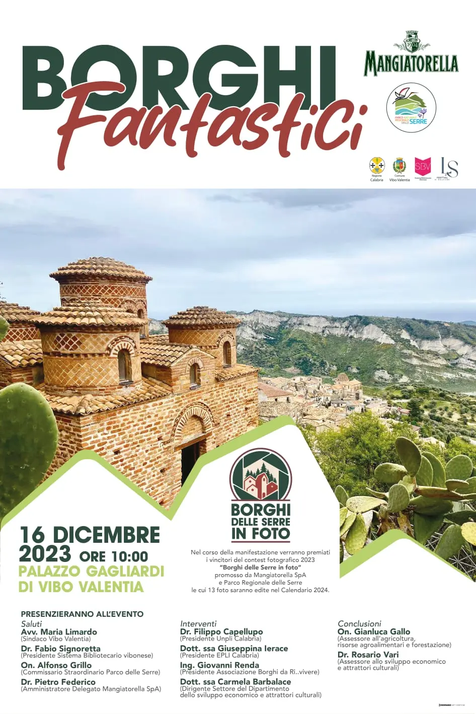 Si terrà Sabato 16 dicembre 2023 alle ore 10 a Vibo Valentia, presso lo storico Palazzo Gagliardi, l’evento promosso dall’ente regionale Parco delle Serre in partnership con la storica azienda “Mangiatorella Spa” allo scopo di sensibilizzare le istituzioni, gli operatori e le giovani generazioni sull’importanza di preservare e promuovere la bellezza unica dei borghi calabresi e di quelli delle Serre. L’evento sarà introdotto dal sindaco di Vibo Valentia, Maria Limardo e da Fabio Signoretta, presidente del Sistema bibliotecario vibonese e dai promotori dell’iniziativa rappresentati da Alfonso Grillo, Commissario straordinario Parco delle Serre e da Pietro Federico, Amministratore Delegato “Mangiatorella Spa”. Interverranno all’incontro, la dottoressa Giuseppina Ierace e il dottor Filippo Capellupo, rappresentanti degli enti che raggruppano tutte le Pro Loco della Regione Calabria, l’ing. Giovanni Renda (Presidente Associazione culturale “Borghi da Ri..vivere”), la dottoressa Carmela Barbalace (Dirigente Settore Borghi e attrattori culturali presso il Dipartimento dello Sviluppo Economico). Concluderanno i lavori Gianluca Gallo, Assessore regionale all’agricoltura, risorse agroalimentari e forestazione e Rosario Varì, Assessore regionale allo Sviluppo Economico e attrattori culturali. All’incontro sono altresì invitati i sindaci dei 27 Comuni facenti parte del Parco delle Serre. L’evento rappresenta un ulteriore passo di un percorso avente come obiettivo la valorizzazione del territorio e delle sue migliori realtà, iniziato nel 2022 con il progetto di collaborazione pubblico-privato siglato tra i due soggetti “Mangiatorella SpA” e “Parco delle Serre” e che ha già visto concretizzarsi moltissime iniziative tra cui l’ideazione di due contest fotografici, l’ultimo dei quali è stato indetto quest’anno, al fine di promuovere la conoscenza dei borghi del territorio del Parco Naturale Regionale delle Serre. Nell’ambito della manifestazione saranno premiati i vincitori del contest con la pubblicazione della propria foto nell’affascinante calendario 2024 oltre ad un voucher valido per un pernottamento gratuito in una struttura ricettiva collocata nel Parco delle Serre. L’autore della foto più bella, che sarà pubblicata nella copertina del calendario, si aggiudicherà anche un premio in denaro di 1000 euro. Il nuovo calendario 2024 è una sintesi attraente di colori, cultura e tanta voglia di esprimersi da parte dei tantissimi partecipanti, appassionati di fotografia e di bellezza. La manifestazione vedrà anche la partecipazione di artisti, direttori di Hotel e strutture ricettive che con la loro testimonianza porteranno all’attenzione di tutti le proprie esperienze di come tutelare, preservare e promuovere il territorio. Un territorio che ha moltissimo da raccontare e che si rivolge a chi lo vive per invitarlo a non abbandonarlo.