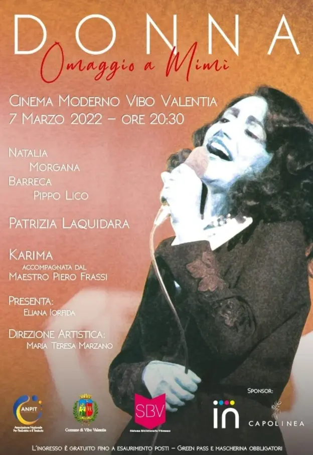 Lunedi 7 marzo alle ore 20.30 il palcoscenico del Cinema Teatro Moderno si illuminerà per ospitare l’evento musicale “Donna, omaggio a Mia Martini”. Lo spettacolo, nato da un’idea di Maria Teresa Marzano che ne ha curato la direzione artistica, è stato fortemente voluto dall’Anpit – Associazione nazionale per l’industria e il terziario Federazione di Vibo Valentia e dal suo presidente provinciale Marco Furnari, il quale ha partecipato al Bando, promosso dal Comune di Vibo Valentia con le risorse messe a disposizione da Fincalabra, che ha inteso sostenere iniziative utili ad incrementare l’attrattività delle città calabresi e degli operatori economici, molto provati da due anni di restrizioni inflitti dall’emergenza Covid.