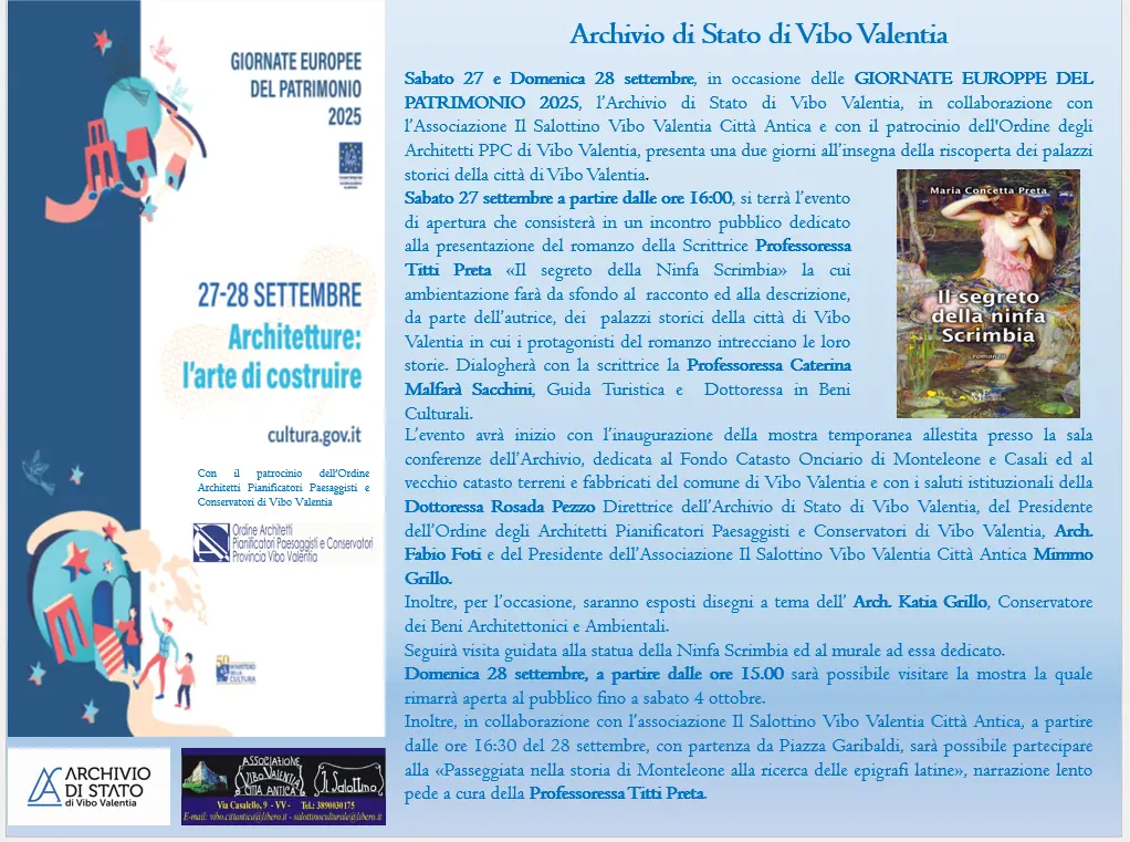 Le celebrazioni inizieranno sabato 27 settembre alle ore 16, con un evento di apertura all'Archivio di Stato. Il momento centrale sarà la presentazione del romanzo "Il segreto della Ninfa Scrimbia" della scrittrice Titti Preta. Durante l'evento, l'autrice descriverà i palazzi storici di Vibo che fanno da sfondo alle vicende del suo libro. La professoressa Caterina Malfarà Sacchini dialogherà con la scrittrice.
