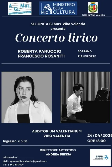 Giovedì 24 aprile alle 18:00 all’Auditorium del Valentianum di Vibo Valentia nuovo appuntamento con la rassegna Vibo in Lirica, promossadalla sezione A.Gi.Mus. Vibo Valentia. Il concerto lirico patrocinato dal Ministero della Cultura e dal Comune di Vibo Valentia vedrà protagonisti il soprano Roberta Panuccio accompagnata al pianoforte dal maestro Francesco Rosaniti.