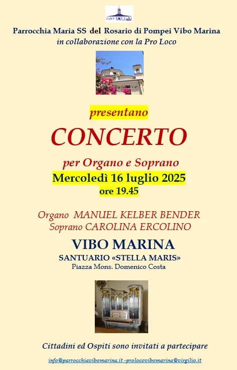 Il Santuario “Stella Maris” di Vibo Marina, la piccola chiesa vicino al porto, ospiterà domani mercoledì 16 luglio 2025 alle ore 20.45 un Concerto per organo e soprano, organizzato dalla Parrocchia Maria SS del Rosario di Pompei in collaborazione con la Pro Loco di Vibo Marina. Ad esibirsi, l’organista tedesco Manuel Kelber Bender e il soprano Carolina Ercolino.