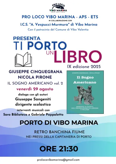 La rassegna “Ti Porto un libro” 2025 si conclude venerdì 29, alle ore 21:30, a Vibo Marina con la presentazione de “Il Sogno Americano”, volume 2, scritto dall’antropologo Pino Cinquegrana e dal giornalista Nicola Pirone. L’evento, organizzato dalla Pro Loco, si svolgerà nell’area della retro-banchina “Fiume”, vicino alla Capitaneria di Porto. Un appuntamento di cultura, musica e riflessione, anche quest’ultimo, per il quale gli stessi organizzatori invitano la cittadinanza a partecipare con lo stesso calore ed entusiasmo finora mostrati per la rassegna estiva dedicata alla lettura. Il secondo volume de “Il Sogno Americano” si concentra sul complesso tema dell’emigrazione calabrese in America tra il XIX e il XX secolo, una storia che ha toccato ogni comunità della regione. Il libro, ricco di fotografie d’epoca inedite fornite da chi ha vissuto quell’esperienza, racconta le storie di uomini, donne e bambini che con coraggio hanno affrontato sfide e pericoli per cercare un futuro migliore.