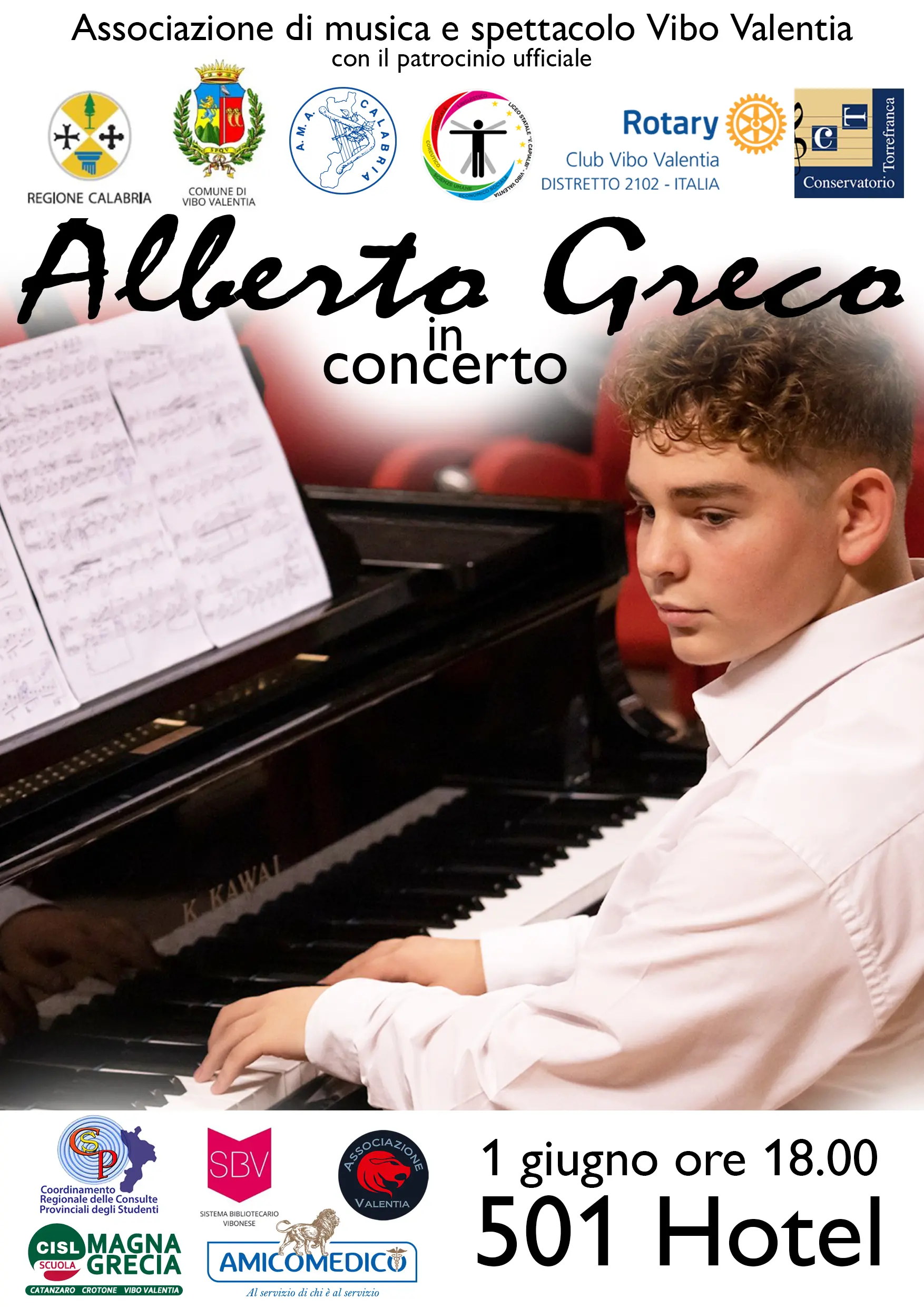 L’associazione di musica e spettacolo di Vibo Valentia, con il patrocinio della Regione Calabria, del Comune di Vibo, dell’AMA Calabria, del liceo “Capialbi” di Vibo, del Rotary club e del Conservatorio “Torrefranca”, presenta “Alberto Greco in concerto”. L’iniziativa si terrà giovedì 1 giugno all’hotel 501 alle ore 18.00. A sposare l’evento, oltre alla Consulta regionale studentesca, la Cisl Scuola, il Sistema bibliotecario Vibonese, l’associazione Valentia e Amico medico. Il repertorio prevede un ventaglio di brani che spazieranno dal classico, al pop/jazz. In apertura la Sonata “Patetica” op.13 di Beethoven; a seguire Listz, “Studio” ; poi “Fantasia-improvviso” di Chopen. Subito dopo “Parla più piano”, da “Il Padrino” di Nino Rota; “Iwill survive” di Gloria Gaynor; “Autumn leaves” di J. Kosma; “Fly me to the mooon” di B. Howard. A questi brani se ne aggiungeranno tanti altri del repertorio nazionale, tra cui “Caruso” di L. Dalla, “Napule è” di P. Daniele. In chiusura un medley dei Queen e “Caribe” di Michel Camilo. [Continua in basso]