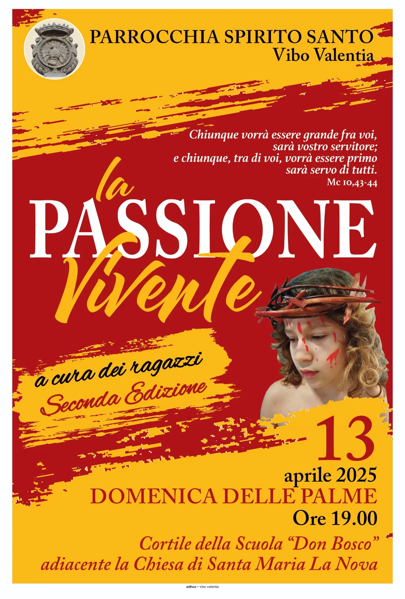 Andrà in scena, domenica 13 aprile a partire dalle ore 19:00, nell’atrio dell’attuale sede della scuola Don Bosco, la seconda edizione della Passione vivente a cura dei ragazzi della Parrocchia dello Spirito Santo di Vibo Valentia, che insieme alle famiglie stanno preparando i costumi di scena.