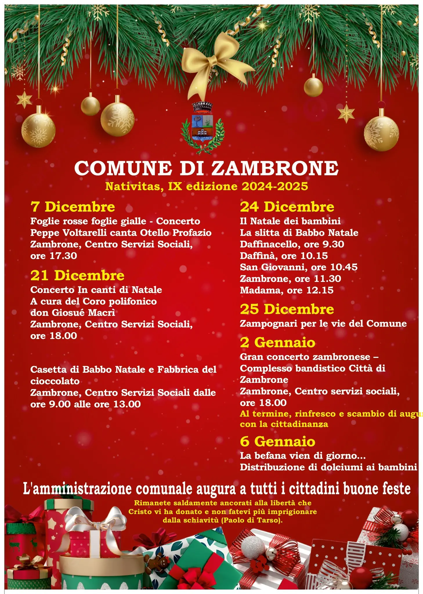 Gli appuntamenti natalizi riservati ai bambini proseguiranno il 24 dicembre mattina con il trenino di Babbo Natale che attraverserà tutti i paesi del territorio comunale. Giorno di Natale poi, come da antica tradizione, il suono delle zampogne allieterà tutte le vie di Zambrone e frazioni con gli zampognari vestiti in costume d’epoca.