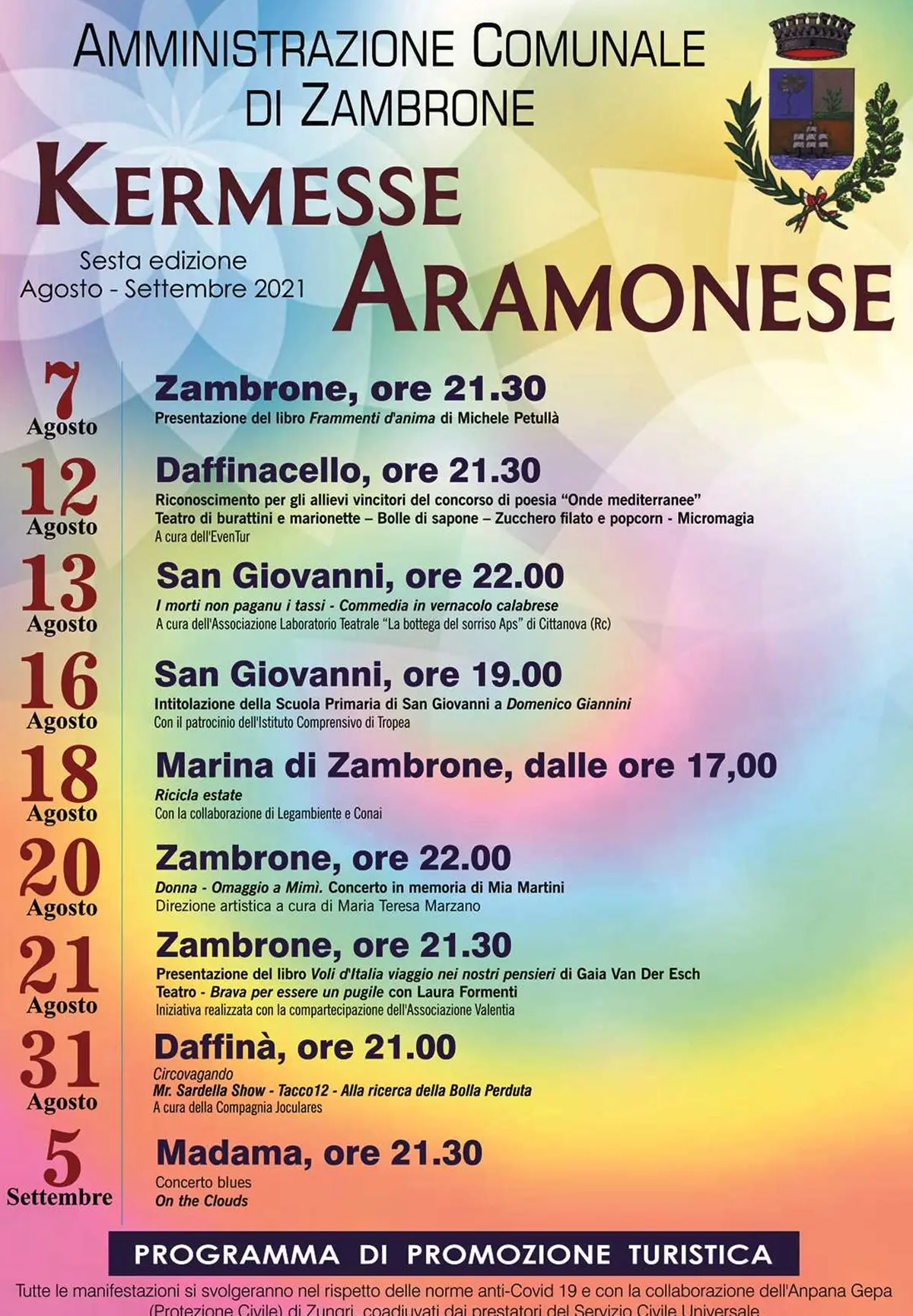 S’inizia il 7 agosto con la presentazione del libro: “Frammenti d’anima” di Michele Petullà. Il 12, nella frazione Daffinacello, l’amministrazione darà un formale riconoscimento per gli allievi vincitori del concorso di poesia “Onde mediterranee”. Teatro di burattini e marionette, bolle di sapone, zucchero filato e popcorn, micromagia allieteranno la serata per i vincitori del concorso e per i loro compagni di scuola. Il 13 a San Giovanni, in linea con gli anni passati, la commedia in vernacolo calabrese: “I morti non paganu i tassi”, a cura dell’associazione Laboratorio Teatrale “La bottega del sorriso Aps” di Cittanova. Il 16 sempre a San Giovanni, alle ore 19, l’intitolazione della scuola primaria a Domenico Giannini, giovane del posto scomparso prematuramente, evento patrocinato dall’Istituto Comprensivo di Tropea. Iniziativa ambientalista alla marina di Zambrone, nel pomeriggio del 18 “Ricicla estate” con la collaborazione di Legambiente e Conai. Evento clou il 20 con “Donna, omaggio a Mimì”. Trattasi di un concerto in memoria di Mia Martini che registrerà la partecipazione di tanti artisti di tutta la Calabria che si alterneranno nella piazza VIII marzo del capoluogo. L’evento avrà la direzione artistica di Maria Teresa Marzano. Da ricordare che nel Museo a cielo aperto “Calabria al femminile”, realizzato dall’artista Antonio La Gamba, il Comune di Zambrone ha dedicato una statua alla vocalist originaria di Bagnara. Il giorno successivo e cioè il 21 agosto, sempre a Zambrone, la presentazione del libro: “Voli d’Italia viaggio nei nostri pensieri” di Gaia Van Der Esch, scrittrice tra le più talentuose del panorama nazionale tanto che nel 2017 è stata inclusa da Forbes tra i 30 under 30 più promettenti al mondo. A seguire, lo spettacolo di Laura Formenti, comica, attrice e performer fra le più brillanti del panorama nazionale. Lo spettacolo messo in scena è: “Brava per essere un pugile”. L’iniziativa sarà realizzata con la compartecipazione dell’Associazione Valentia. Il 31 a Daffinà “Circovagando” con gli artisti di strada della compagnia Joculares; gli spettacoli proposti: Mr. Sardella Show, Tacco12 e Alla ricerca della bolla perduta. Si chiude il 5 settembre con il concerto Blues in Madama, col gruppo: “On the Clouds”. Tutte le manifestazioni si svolgeranno con la collaborazione dell’Anpana Gepa (Protezione Civile) di Zungri, coadiuvati dai prestatori del Servizio civile universale.