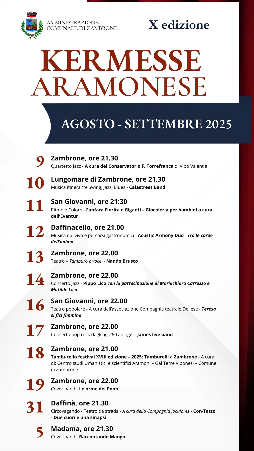 La “Kermesse Aramonese” celebra la sua decima edizione a Zambrone con un ricco programma di eventi culturali e di intrattenimento che si svolgeranno tra agosto e settembre. Organizzata dall’Amministrazione comunale di Zambrone, la rassegna mira a coniugare turismo, intrattenimento e cultura, offrendo eventi di alto livello in tutte le frazioni del territorio comunale. Il programma prevede appuntamenti serali a Zambrone, Daffinacello, Daffinà, San Giovanni e Madama, con l’obiettivo di valorizzare tutti i centri abitati comunali. L’offerta culturale e ricreativa è pensata per tutte le età, unendo bellezza, divertimento e tradizione. Il cartellone completo include: