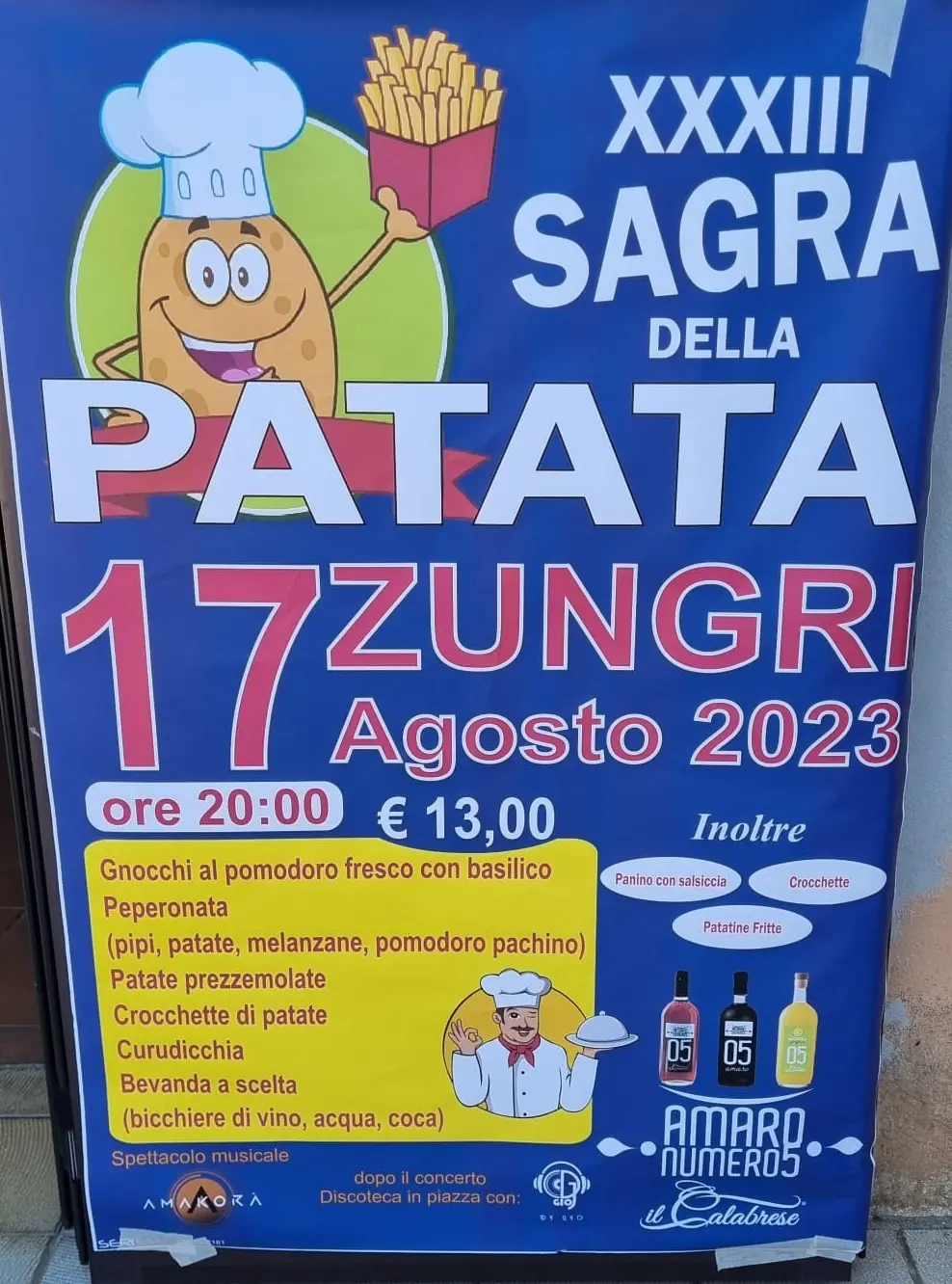 Compie quest’anno trentatré anni ed è una delle manifestazioni più longeve del comprensorio vibonese. A Zungri si lavora per la realizzazione della storica “Sagra della patata”. Un appuntamento – quello del 17 agosto dalle ore 20.00– ormai tradizionale che punta alla promozione della cultura enogastronomica e anche delle produzioni locali. La sagra viene concretizzata grazie all’impegno del Comitato giovanile zungrese. L’evento richiama ogni anno centinaia di presenze turistiche e locali. Tutto viene organizzato nei minimi dettagli con l’obiettivo di garantire accoglienza e pietanze di qualità: «Lo stand gastronomico è, ovviamente, a base di patate, tipico tubero del territorio zungrese, coltivato in terreni sabbiosi che nelle nostre campagne abbondano. Identifica Zungri così come l’olio e la “suriaca” a burro o cannellina», anticipano i promotori aggiungendo che «la serata viene patrocinata dall’amministrazione comunale e rientra nel programma finanziato con fondi della legge regionale n. 13/85». Per l’occasione, Museo della civiltà contadina e le grotte rimarranno straordinariamente aperte al pubblico anche in serata. L’appuntamento con i sapori della tradizione sarà arricchito dallo spettacolo di musica e balli popolari calabresi grazie al concerto del gruppo etno-folk Amakorà. A seguire discoteca in piazza con dj Gio.