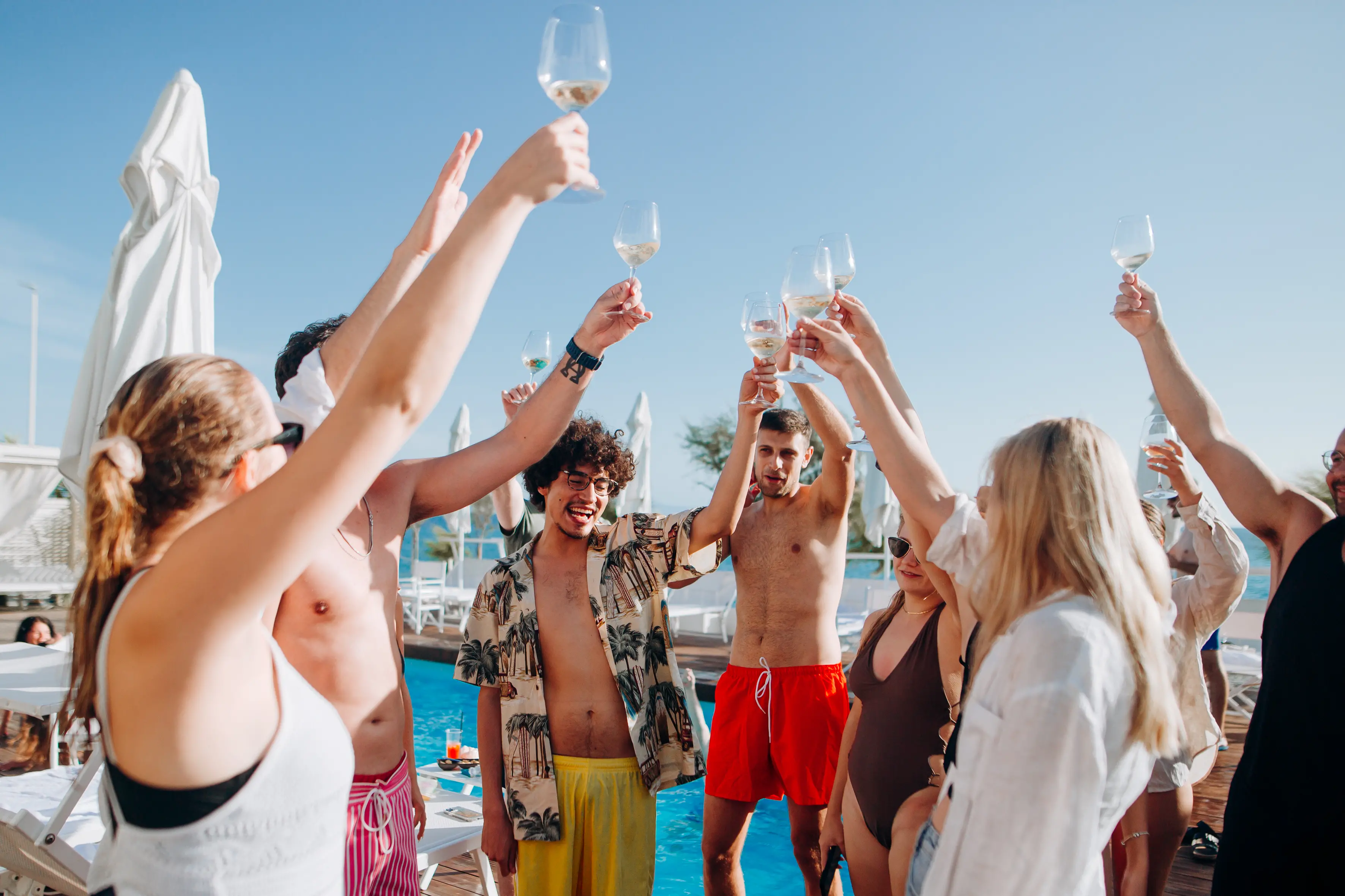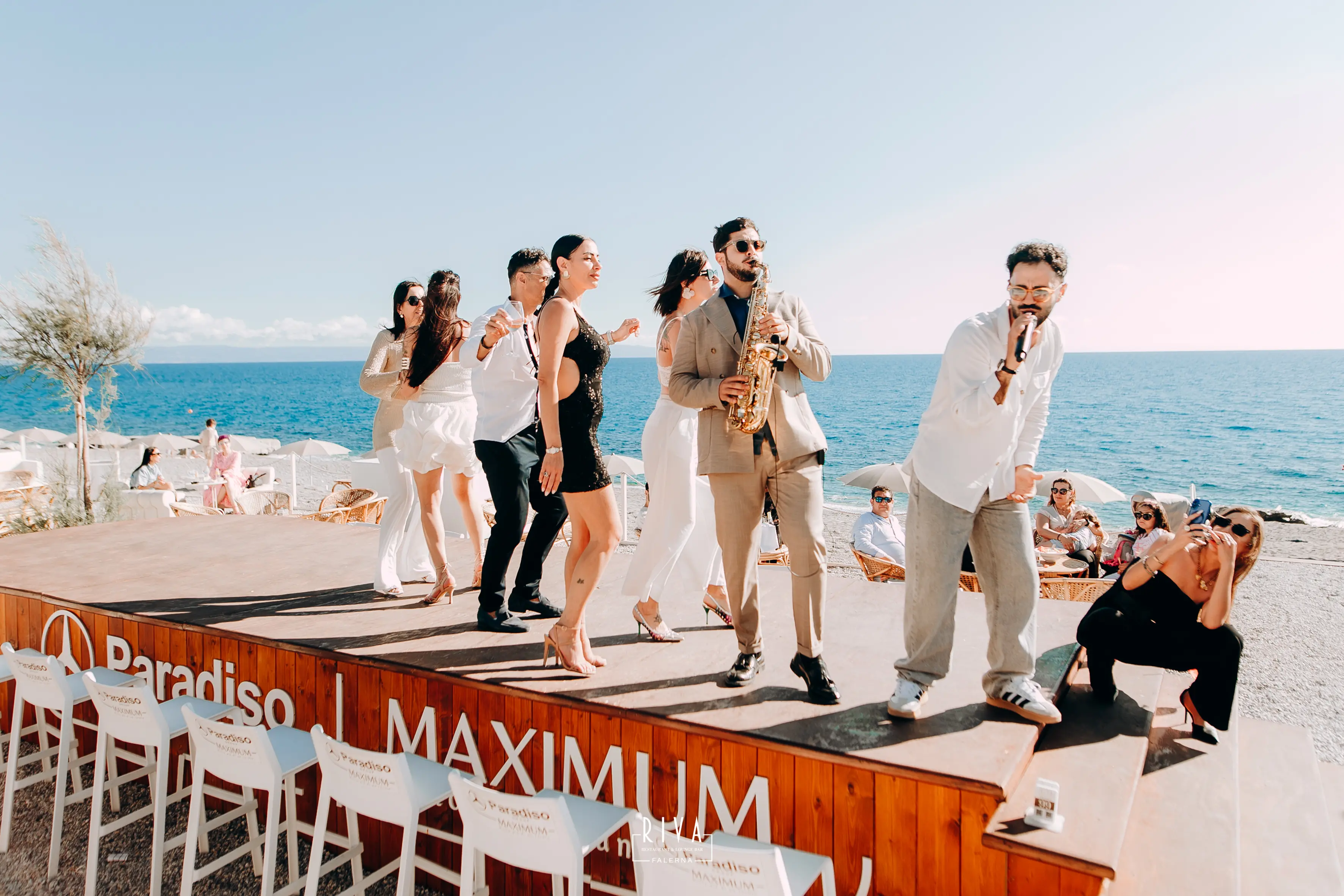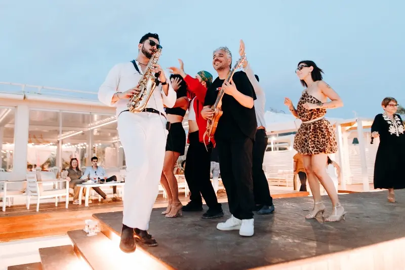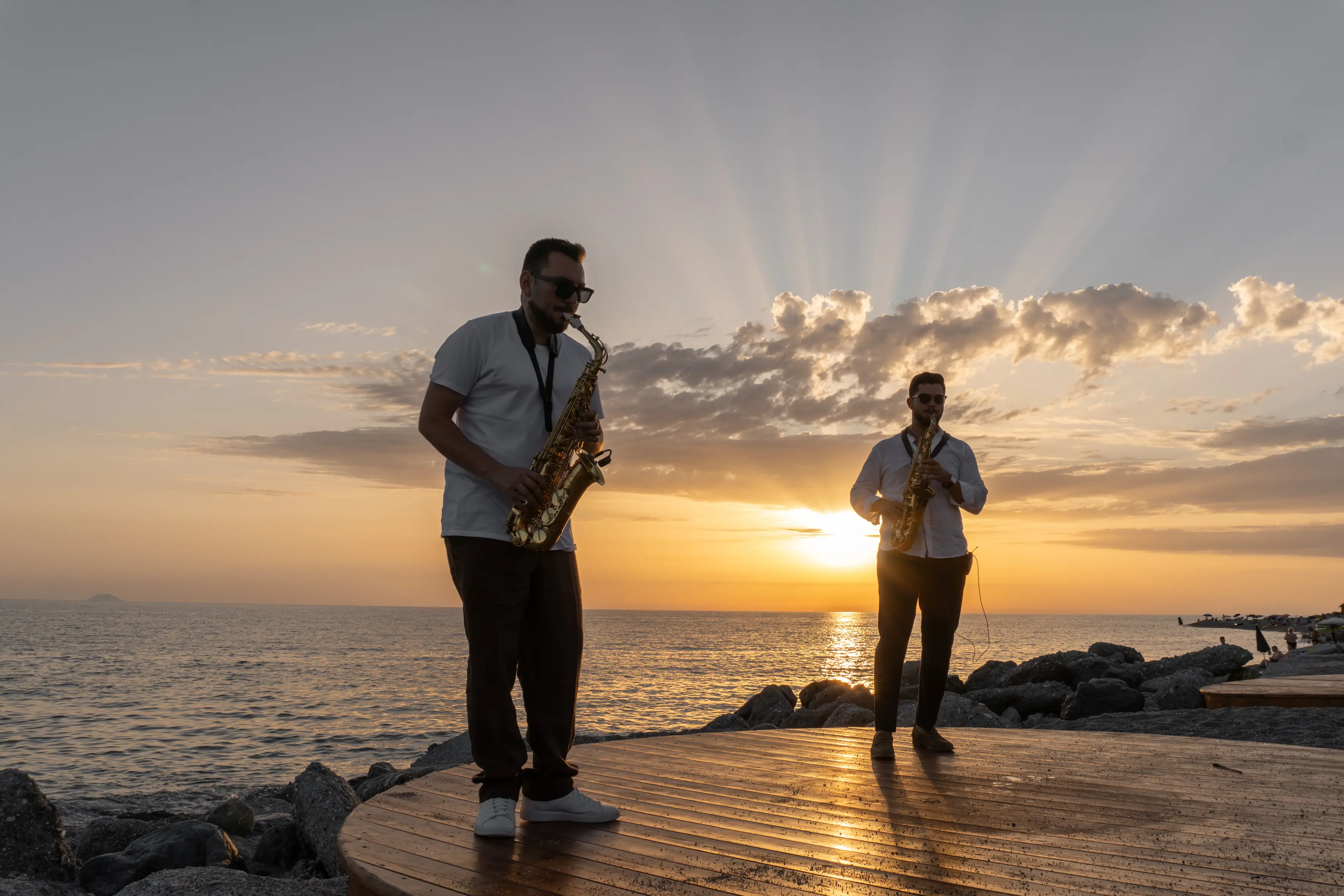 E quando il sole calerà sull’orizzonte, le note del jazz prenderanno il posto del ritmo, offrendo un momento di forte coinvolgimento con lo show di doppio sax raffinata tra un drink e una chiacchiera.