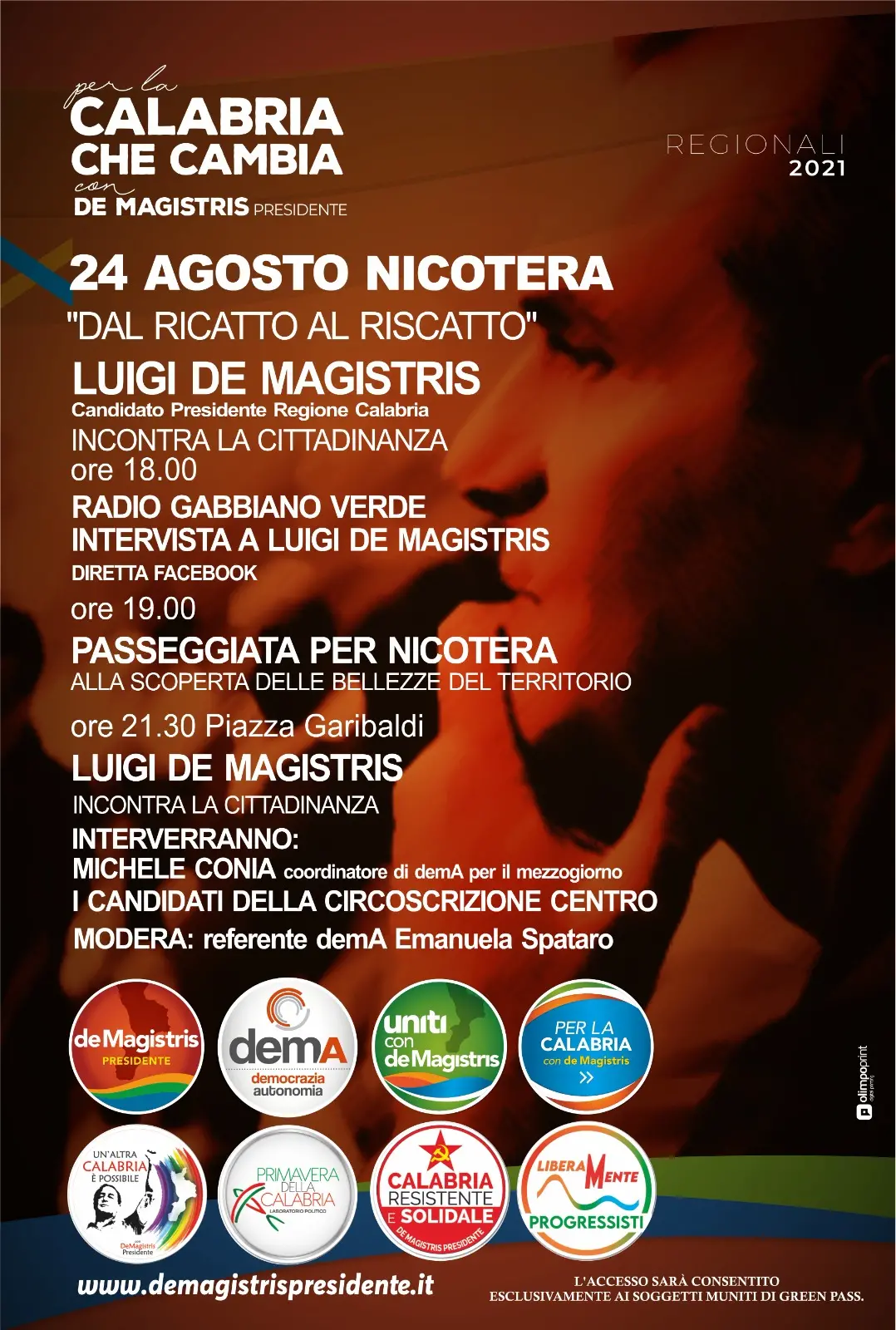 Sarà oggi a Nicotera per incontrare la cittadinanza il candidato alla presidenza della Regione Calabria Luigi De Magistris. Alle ore 18.00 è prevista un’intervista a Radio Gabbiano Verde che verrà trasmessa in diretta su facebook. Alle ore 19.00, invece, passeggiata per Nicotera alla scoperta delle bellezze del territorio. Alle 21.30, infine, Luigi De Magistris incontrerà i cittadini in piazza Garibaldi. Sono previsti gli interventi di Michele Conia, coordinatore di demA per il Mezzogiorno, ed i candidati della circoscrizione Centro. Modererà la referente demA Emanuela Spataro.
