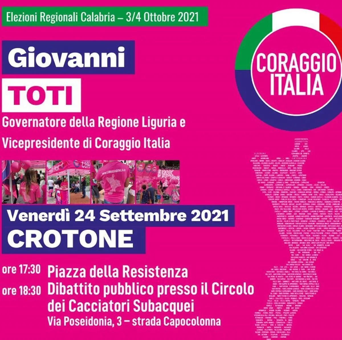 Venerdì 24 settembre il primo appuntamento è a Vibo Valentia, alle ore 10.30, per una passeggiata su Corso Vittorio Emanuele III con successiva sosta al gazebo di “Coraggio Italia” allestito all’incrocio con Piazza Luigi Razza. Alle ore 11.30 poi, all’Hotel 501, è previsto un incontro con dirigenti, candidati, simpatizzanti ed elettori. Nel pomeriggio, invece, tappa a Crotone. Si comincia con l’iniziativa delle ore 17.30 in Piazza della Resistenza. Poi, ore 18.30, dibattito pubblico al Circolo dei Cacciatori Subacquei, in via Poseidonia 3, sulla strada per Capocolonna.