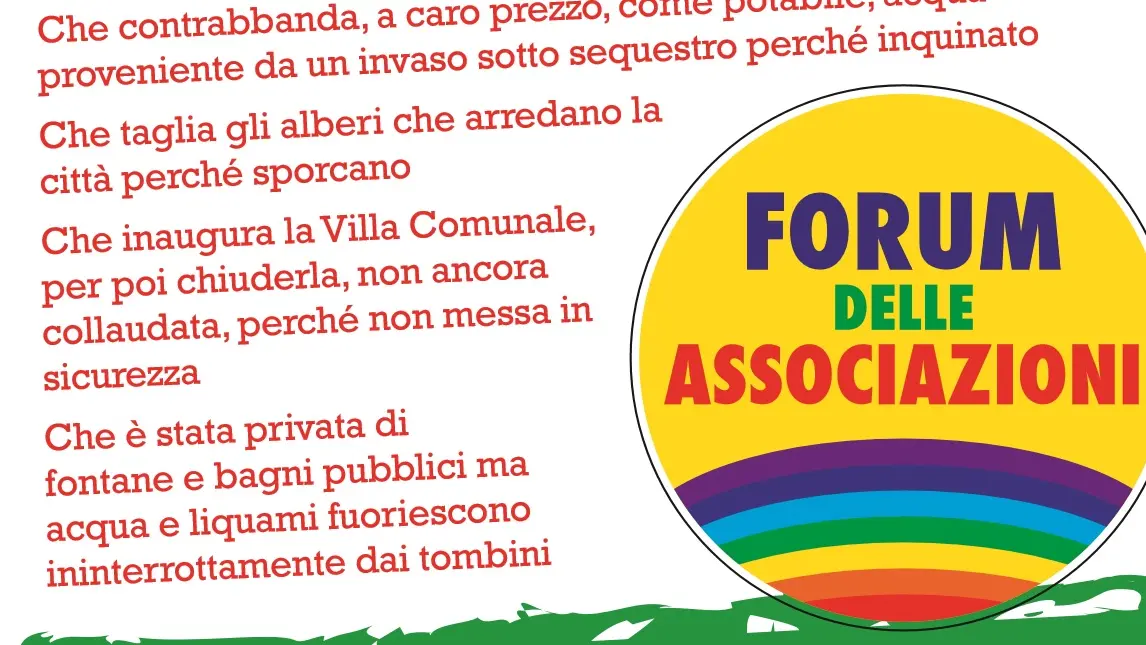 Ciò su cui mette l’accento il Forum è, oltre alla dibattuta questione delle strisce che sdoganano l’abitudine di utilizzare la principale piazza della città come parcheggio, è un’idea di città che va in direzione letteralmente opposto ad un progresso civile. «Una città – annotano gli attivisti -stabilmente arroccata agli ultimi posti per raccolta differenziata dei rifiuti; che contrabbanda, a caro prezzo, come potabile, acqua proveniente da un invaso sotto sequestro perché inquinato; che taglia gli alberi che arredano la città perché sporcano; che inaugura la Villa comunale, per poi chiuderla, non ancora collaudata, perché non messa in sicurezza; che è stata privata di fontane e bagni pubblici ma acqua e liquami fuoriescono ininterrottamente dai tombini».
