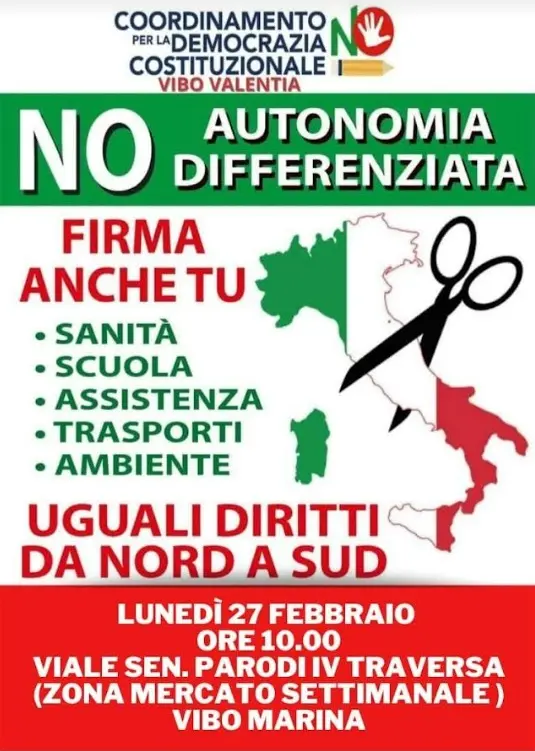 Lunedì 27 febbraio alle ore 10 sarà avviata a Vibo Marina, viale Parodi zona mercato settimanale, una raccolta di firme contro la proposta di autonomia regionale differenziata che definisce i principi per l’attribuzione, alle Regioni a statuto ordinario, di ulteriori forme e condizioni di autonomia. L’iniziativa è stata promossa dal Coordinamento per la Democrazia Costituzionale di Vibo Valentia con l’obiettivo di dire no alla proposta di legge e riaffermare la necessità di avere uguali diritti da nord a sud. La finalità della raccolta di firme è la presentazione di una proposta di legge costituzionale di iniziativa popolare per modificare l’art. 116 comma 3 della Costituzione concernente il riconoscimento alle Regioni di forme e condizioni particolari di autonomia e dell’art. 117 commi 1,2,3, con l’introduzione di una clausola di supremazia della legislazione statale in alcune materia quali sanità, scuola, assistenza, trasporti, ambiente. [Continua in basso]