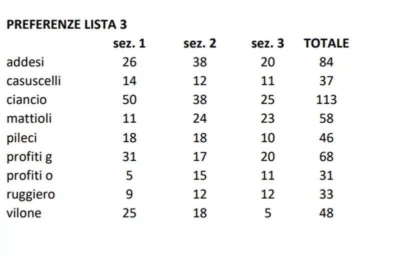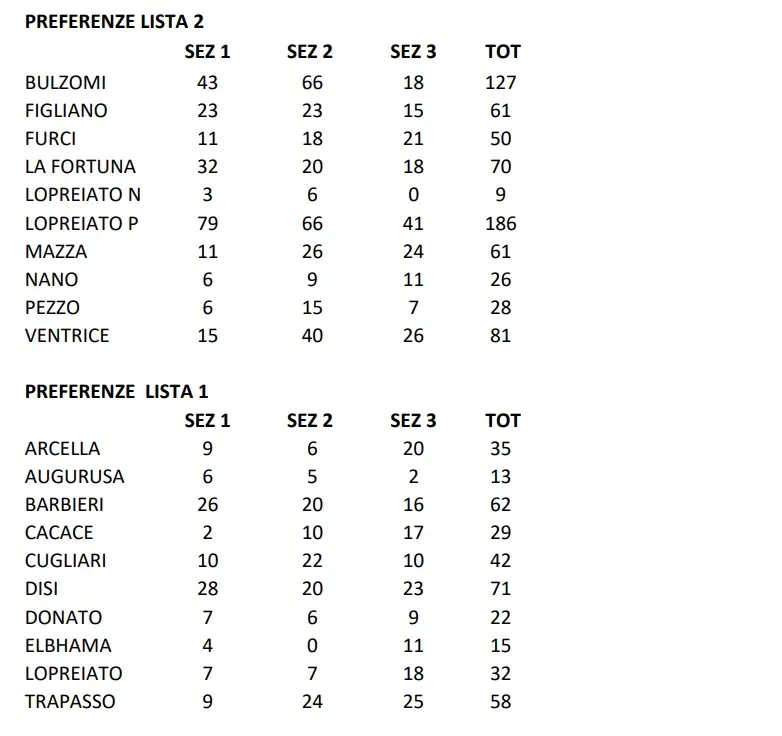 Entrano in Consiglio comunale i primi sette che hanno riportato il maggior numero di preferenze con la lista di Antonino Pezzo: Nicola Lopreiato (186 voti); Salvatore Bulzomì (127 voti); Pasqualina Ventrice (81 voti); Rossana La Fortuna (70 voti, consigliere uscente); Antonio Figliano (61 voti, consigliere uscente); Antonio Mazza (61 voti, consigliere uscente); Erminia Furci (50 voti).