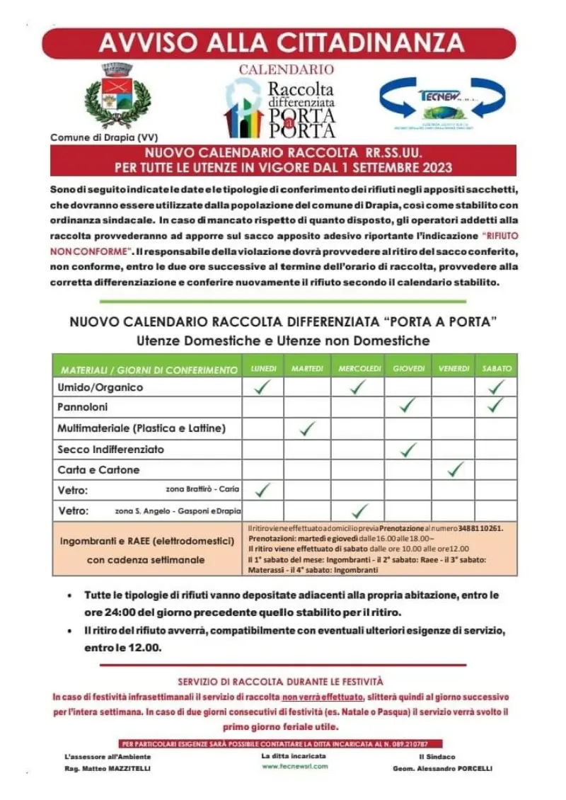 Sul nuovo calendario per la raccolta differenziata, recentemente diramato dal Comune di Drapia e in vigore da oggi, 1 settembre, per tutte le tipologie di utenze, il capogruppo d’opposizione Giuseppe Rombolà espone pubblicamente i propri dubbi in merito alla redazione dello stesso documento e accende il dibattito sugli accordi tra ditta e Comune pattuiti nel capitolato d’appalto: «Di certo per un mio limite, anche nel comprendere la lingua italiana, non riesco a capire cinque cose: la prima, a quale ordinanza sindacale ci si riferisce nel testo all’inizio? La seconda, cosa significa nella parte scritta in rosso “…slitterà quindi il giorno successivo per l’intera settimana…”; la terza, quando si verificheranno due giorni di festività consecutivi – in realtà basta controllare il calendario per accorgersi che quest’anno già a Natale ve ne saranno tre -, perché non deve essere svolto il servizio, considerato che il capitolato d’appalto – per redigere il quale abbiamo speso un bel po’ di soldini – al quale la ditta dovrebbe attenersi, all’art. 4, recita così? ” Il servizio dovrà essere garantito per sei giorni alla settimana da lunedì a sabato, (compresi i giorni festivi)”». L’ultimo quesito, infine, sollevato, riguarda le utenze commerciali: «Non comprendo la ragione per la quale, quantomeno per le utenze commerciali, già da capitolato non è prevista la raccolta bisettimanale del rifiuto differenziato secco».