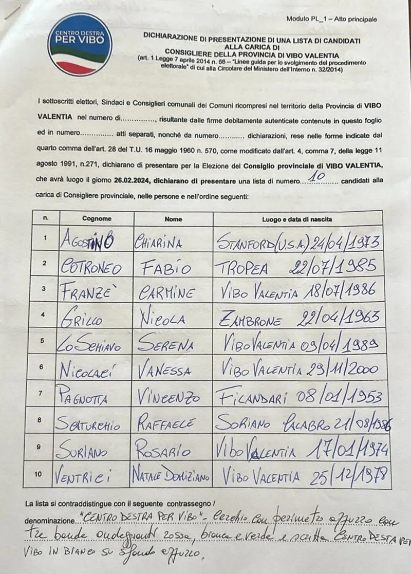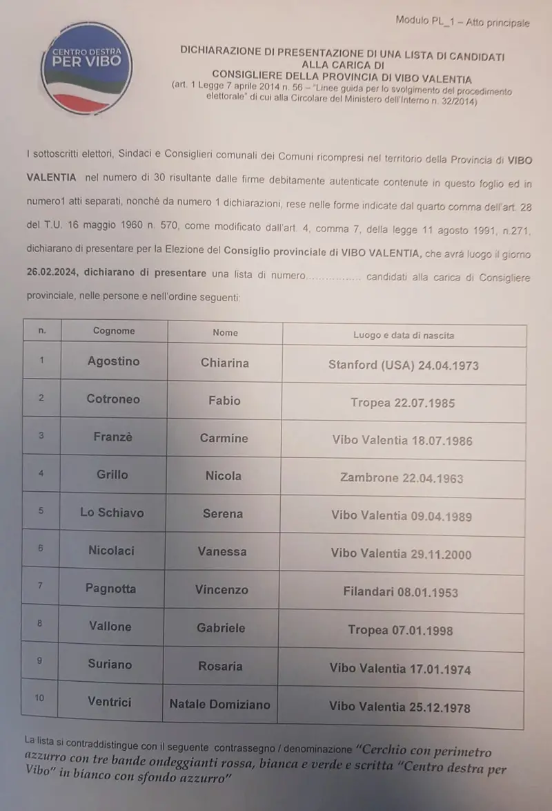 Presentata la lista di Forza Italia e Fratelli d’Italia che concorrerà per il rinnovo del Consiglio provinciale di Vibo Valentia. E’ denominata “Centrodestra per Vibo” e schiera consiglieri comunali ed assessori di diversi Comuni del Vibonese. Volti noti e meno noti e non mancano alcune particolarità, atteso che vengono candidati nello schieramento di centrodestra pur governando in alcuni casi nei propri Comuni con maggioranza di colore politico avverso. Questi i dieci candidati al Consiglio provinciale: Chiarina Agostino, 51 anni, consigliere comunale ad Arena; Fabio Cotroneo, 39 anni, consigliere comunale a Zambrone; Carmine Franzè, 38 anni, consigliere comunale a Serra San Bruno; Nicola Grillo, 61 anni, vicesindaco del Comune di Zambrone; Serena Lo Schiavo, 35 anni, consigliera comunale a Vibo Valentia; Vanessa Nicolaci, 24 anni, consigliera comunale a Dinami; Vincenzo Pagnotta, 71 anni, vicesindaco del Comune di Pizzo; Gabriele Vallone, 26 anni, consigliere comunale a Parghelia (già con delega alla Cultura); Rosaria Suriano, 50 anni, vicesindaco di San Gregorio d’Ippona; Natale Domiziano Ventrici, 46 anni, consigliere comunale a San Calogero. Alcune particolarità: tutti i candidati – chi più, chi meno – sono vicini a Forza Italia, tranne Fabio Cotroneo vicino a Fratelli d’Italia. Nella lista “Democratici e Progressisti” (Pd e M5S) è candidato a consigliere provinciale anche il sindaco di Arena, Antonino Schinella (esponente storico del Pd, quindi centrosinistra, ed in passato candidato anche alla presidenza della Provincia). Nella lista del “Centrodestra per Vibo” è ora candidata al Consiglio provinciale anche una consigliera della sua maggioranza, Chiarina Agostino. Sempre nella lista di centrodestra trova poi spazio Carmine Franzè, già assessore alle Politiche sociali del Comune di Serra San Bruno nell’attuale compagine amministrativa. Carmine Franzè è stato consigliere comunale di Serra San Bruno dal 2011 al 2016 e poi assessore allo Sport ed al Turismo. Nell’agosto del 2018 era stato nominato autista dell’allora consigliere regionale di Forza Italia (presidente del gruppo consiliare di Fi) Claudio Parente. Nel settembre 2020, Carmine Franzè è stato invece eletto consigliere comunale di Serra con la lista “LiberaMente” del sindaco Alfredo Barillari, schierata contro altre formazioni sostenute a livello comunale da esponenti di Forza Italia. Attualmente Carmine Franzè fa parte della Struttura speciale dell’assessore regionale Rosario Varì (ne è l’autista). Nella prima bozza della lista del centrodestra risultava candidato al Consiglio provinciale anche l’attuale sindaco di Dasà, Raffaele Scaturchio (vicino a Forza Italia), ma tale nominativo è stato poi sostituito con quello di Gabriele Vallone, consigliere comunale a Parghelia, eletto nel maggio dello scorso anno a sostegno del sindaco Antonio Landro, quest’ultimo storico esponente del Pd e del centrosinistra. Gabriele Vallone detiene al Comune di Parghelia le deleghe alla Cultura e alla Pubblica istruzione che gli sono state conferite dal sindaco il quale – sino a prova contraria – si troverà a sostenere alle provinciali la lista del Pd contro la quale è candidato il suo consigliere Vallone. [IN BASSO LA LISTA e ANCHE LA PRIMA BOZZA DOVE FIGURAVA IL NOME DI SCATURCHIO]