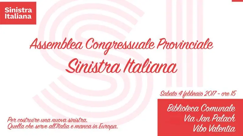 Si terrà sabato 4 febbraio, nei locali della Biblioteca comunale di Vibo Valentia, l’Assemblea congressuale provinciale di Sinistra Italiana, al termine della quale saranno eletti i delegati al Congresso nazionale fondativo di Rimini, in programma dal 17 al 19 febbraio.
