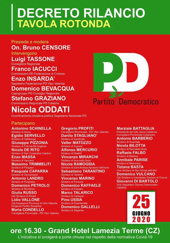 Una tavola rotonda per approfondire le occasioni offerte dal Decreto Rilancio in una fase in cui è urgente ripartire dopo gli effetti nefasti, dal punto di vista economico oltre che sanitario, del Covid-19. È questa l’idea del consigliere regionale Luigi Tassone e del già deputato Bruno Censore che hanno organizzato per giovedì alle 16.30 presso il Grand Hotel di Lamezia Terme un’iniziativa a cui parteciperanno numerosi sindaci e consiglieri provinciali del Pd e il presidente del Gal “Serre calabresi”. La discussione si svolgerà a porte chiuse nel rispetto della normativa anti-contagio.