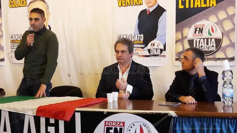 Al tavolo, al fianco di Fiore, il segretario regionale di Forza Nuova Davide Pirillo e i candidati Edoardo Ventra e Michele Colace. L’ex capo di Terza posizione, reduce dalla movimentata notte maceratese in cui i militanti neofascisti hanno fronteggiato in piazza schiere di poliziotti in tenuta antisommossa, non indietreggia rispetto all’episodio di cronaca deflagrato in piena campagna elettorale.