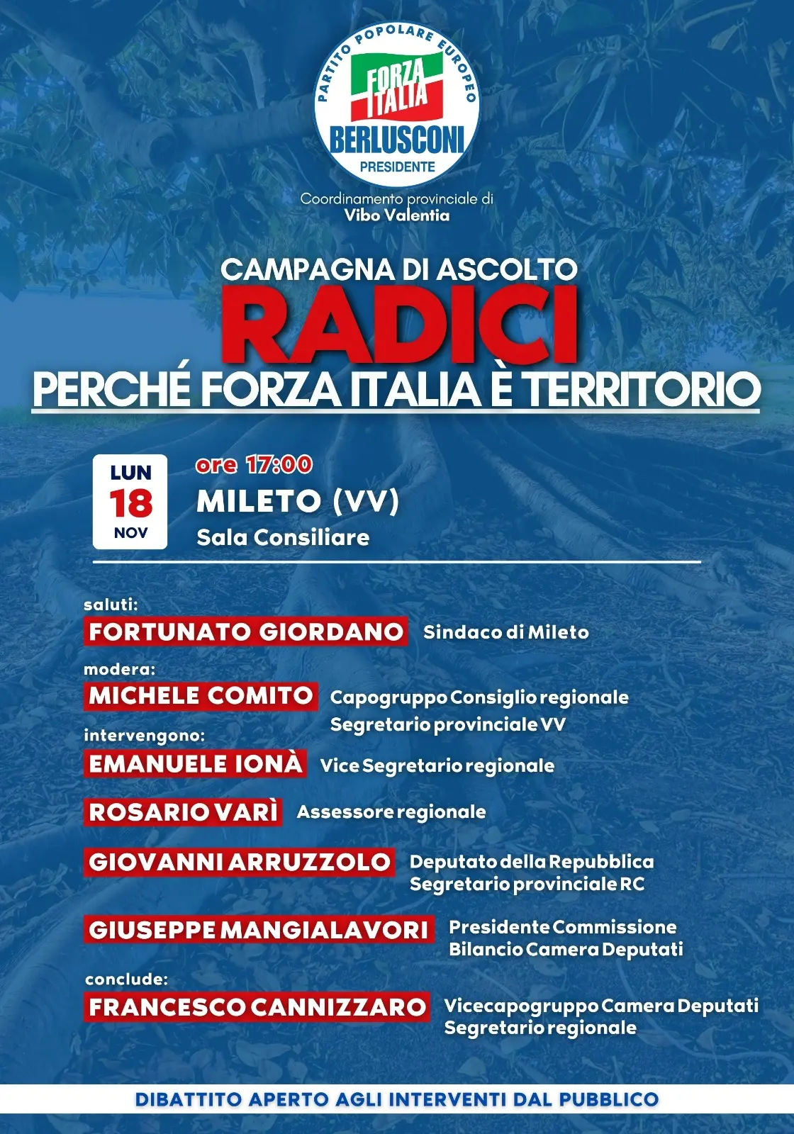 L’incontro in programma nella sala consiliare della cittadina normanna sarà moderato dal capogruppo in consiglio regionale, nonché segretario provinciale del partito, Michele Comito. Dopo il dibattito aperto agli interventi del pubblico presente, a trarre le conclusioni sarà il vice capogruppo alla Camera dei Deputati e segretario regionale di Forza Italia Francesco Cannizzaro. L’iniziativa itinerante, ideata dal coordinamento regionale del movimento politico, è partita sabato 16 novembre a Rosarno, con l’obiettivo di dare voce ai vari territori delle province calabresi, nessuno escluso, di recuperare la fiducia degli elettori e di contrastare la piaga dell’astensionismo. La campagna d’ascolto “Radici” prevede in totale 20 tappe, 4 per ogni provincia, da svolgersi nell’arco di un mese. Tra queste rientra, appunto, il secondo appuntamento di domani previsto a Mileto.
