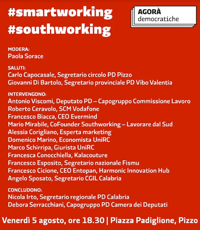 Introdotti da Antonio Viscomi, capogruppo Pd in Commissione Lavoro alla Camera, e moderati da Paola Sorace, di tutto questo discuteranno: Roberto Ceravolo (Vodafone), Francesco Biacca (EverMind), Mario Mirabile (Southworking), Alessia Corigliano (esperta marketing), Domenico Marino (economista UniRC), Marco Schirripa (giurista UniRC), Francesco Cicione (Entopan), Francesca Conocchiella (Kalacouture), Francesco Esposito (Fismu) e Angelo Sposato (Cgil Calabria). A loro si affiancheranno, in un indirizzo di saluto, Carlo Capocasale e Giovanni Di Bartolo (segretari Pd del circolo di Pizzo e della federazione provinciale di Vibo). Le conclusioni – e quindi le proposte da portare avanti in sede regionale e nazionale – saranno affidate a Nicola Irto, segretario regionale e a Debora Serracchiani, presidente del gruppo parlamentare alla Camera del Partito Democratico.
