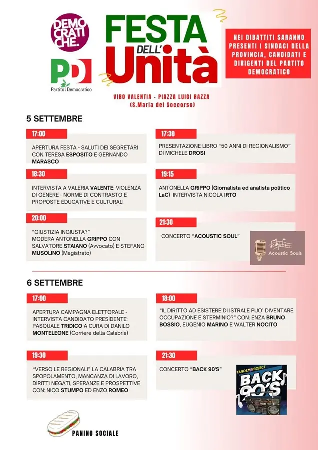 La Federazione provinciale del Partito Democratico e il circolo di Vibo Valentia hanno organizzato anche quest’anno la Festa dell’Unità, che si terrà il 5 e 6 settembre in piazza Luigi Razza. Diversi gli interventi in programma, dal candidato a presidente della Regione Pasquale Tridico al segretario regionale del partito Nicola Irto, fino al sindaco della città Enzo Romeo.
