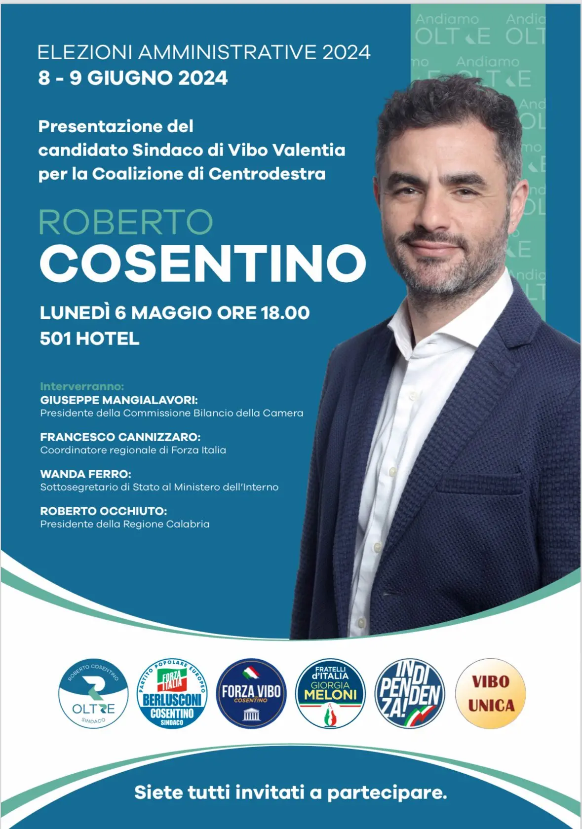 Saranno sei le liste a sostegno del candidato a sindaco di Vibo Valentia per il centrodestra, Roberto Cosentino. Se ognuna delle liste arriverà a completare il “quadro” delle candidature per il rinnovo del Consiglio comunale, i conti sono presto fatti: ben 192 aspiranti consiglieri con la coalizione di centrodestra, 32 per ogni lista. La presentazione del candidato a sindaco Roberto Cosentino per le elezioni amministrative – fissate per i giorni 8 e 9 giugno prossimi – è in programma per lunedì 6 maggio alle ore 18:00 al 501 Hotel. Sono previsti gli interventi: del deputato di Forza Italia, Giuseppe Mangialavori, presidente della Commissione Bilancio della Camera dei deputati; del coordinatore regionale di Forza Italia Francesco Cannizzaro; del sottosegretario al Ministero dell’Interno Wanda Ferro; del presidente della giunta della Regione Calabria Roberto Occhiuto. Queste invece le liste a sostegno della candidatura di Roberto Cosentino a sindaco di Vibo Valentia: lista Oltre (compagine ritenuta espressione dello stesso aspirante primo cittadino); Forza Italia; Forza Vibo; Fratelli d’Italia; Indipendenza (che fa capo a livello nazionale a Gianni Alemanno e a livello locale all’ex senatore Franco Bevilacqua); Vibo Unica che fa capo al consigliere comunale Stefano Luciano.