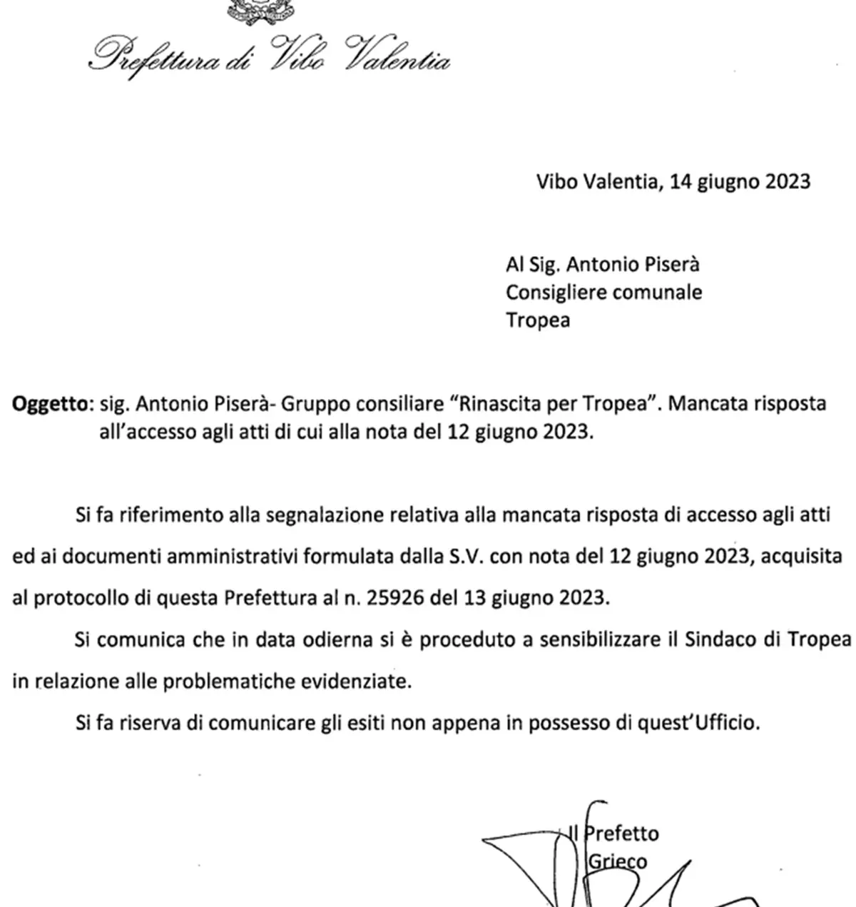 LEGGI ANCHE: Comune di Tropea, accesso agli atti negato al consigliere Piserà che si rivolge al prefetto