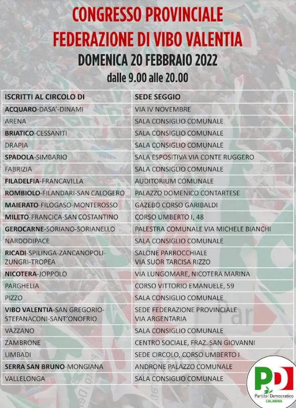 Domani, domenica 20 febbraio 2022 dalle ore 9.00 alle ore 20.00, seggi aperti per l’elezione del segretario e dell’assemblea provinciale di Vibo Valentia. Si voterà inoltre per il rinnovo degli organismi del circolo Pd della Città capoluogo. La Commissione provinciale ha concluso le procedure per la costituzione dei seggi. Le operazioni di voto – si legge in un comunicato inviato alla stampa – si svolgeranno nel rispetto delle vigenti normative anticontagio.