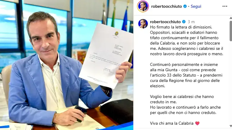 Poche righe accompagnate da una foto in cui mostra un foglio. Non un foglio qualunque, ma la lettera di dimissioni. Così Roberto Occhiuto annuncia di aver firmato.