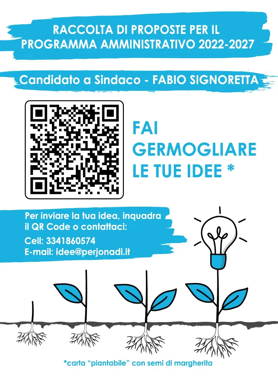 «Oltre ai canali social – spiega oggi Signoretta, illustrando l’iniziativa – la raccolta delle proposte avverrà con una campagna di sensibilizzazione che riguarderà ogni singolo cittadino, con l’utilizzo di un volantino 100% ecosostenibile che, al termine dell’utilizzo, può essere fatto germogliare grazie ai semi contenuti al proprio interno. Un’idea innovativa per garantire il rispetto dell’ambiente – prosegue – senza correre quindi il rischio di “sporcare” il territorio, ma anzi ponendo in essere un’iniziativa che può fungere da spunto per le azioni programmatiche future». L’obiettivo finale dell’iniziativa, così come specifica in conclusione lo stesso esperto in materia di fondi europei – tra l’altro recentemente selezionato dal Consiglio d’Europa tra i quaranta ambasciatori italiani, nell’ambito dell’Anno dei giovani- «è dunque di realizzare un programma che, oltre al lavoro pragmatico e quotidiano messo in campo dai candidati, possa essere diretta espressione del fabbisogno della popolazione locale».