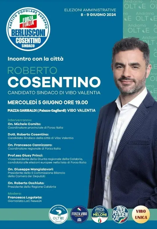 Mercoledì 5 giugno, alle ore 19 in piazza Garibaldi a Vibo Valentia, il coordinamento provinciale di Forza Italia incontrerà i cittadini. Previsti gli interventi dei massimi rappresentanti del partito in Calabria, al fianco del candidato a sindaco della città capoluogo, Roberto Cosentino.