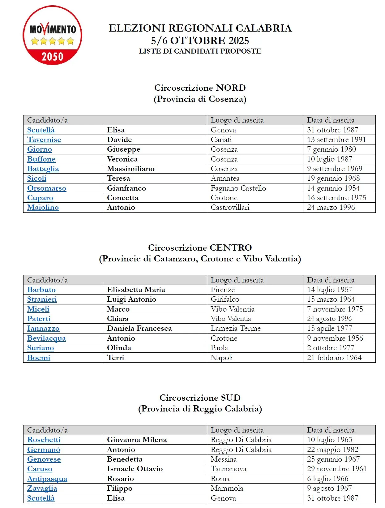 «Gli iscritti al Movimento della Regione Calabria, con iscrizione da almeno 6 mesi in corso di validità, potranno votare per la proposta di liste circoscrizionali relative alla propria Regione. In caso di non approvazione della proposta, si procederà immediatamente al metodo alternativo della votazione individuale tra le proposte di autocandidatura pervenute, con la conseguenza che le liste saranno composte, a seguito di detta votazione, seguendo l’ordine decrescente del numero di preferenze ricevute nel rispetto degli obblighi di rappresentanza di genere previsti dalla legge.