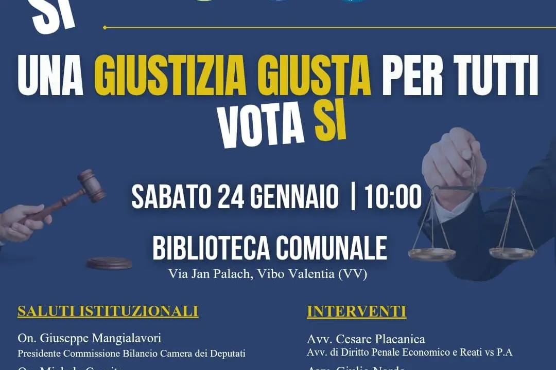 Entrano nel vivo le attività del Comitato per il “SÌ” di Forza Italia in vista del referendum costituzionale del 22 e 23 marzo. Dopo la recente costituzione dell'organismo, sabato 24 gennaio 2026, alle ore 10, la Biblioteca comunale di Vibo Valentia ospiterà il primo grande evento pubblico di approfondimento sulla riforma della separazione delle carriere.