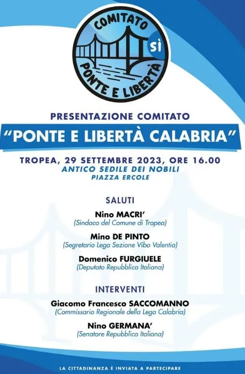 «Sul Ponte dello Stretto si sono scritti, da oltre 30 anni, fiumi di parole, ma spesso non è stata detta la verità e vi è stata un’informazione del tutto tendenziosa ed errata. Seguendo l’esempio della Sicilia e del senenatore Nino Germanà, nasce in Calabria il “Comitato Ponte e libertà” in Tropea, con la presenza dello stesso, del sindaco, Nino Macrì, del segretario sezione Vibo Valentia Lega, Mino De Pinto, dell’onorevole Domenico Furgiuele, e del commissario regionale Lega, Giacomo Francesco Saccomanno». Lo anticipano gli stessi esponenti della Lega aggiungendo: «L’obiettivo è quello di smontare trent’anni di menzogne su quest’opera fondamentale per lo sviluppo della Calabria, della Sicilia e del Mezzogiorno e dare voce a cittadini e imprese che rifiutano l’assistenzialismo come fonte di sussistenza. La pace fa ponti e garantisce prosperità -ha commentato il senatore Germanà-. La guerra e la povertà e l’odio e l’ignoranza fanno saltare i ponti, le gallerie e tutto ciò che favorisce l’unione dei popoli. Ponte e libertà è uno slogan apartitico che unisce due concetti fondanti dell’articolo 1 e 16 della Costituzione della Repubblica Italiana, fondata sulla democrazia, il lavoro, la libertà di movimento uguale per tutti i cittadini italiani». Per la Lega «vi è la necessità di dare un punto di riferimento della verità tecnica e scientifica, anche ovvia, sul fatto che un ponte sia meglio di una nave e sui vantaggi della realizzazione di tutte le infrastrutture che danno libertà, migliorano la vita dei cittadini e ne favoriscono l’integrazione culturale e la crescita economica e sociale. Sotto lo slogan “Ponte e libertà” il Comitato intende accogliere tutta quella parte del territorio che, al di là dell’appartenenza politica, vuole l’infrastruttura, dando voce alle classi meno abbienti che per spostarsi da e per la Sicilia viaggiano di notte in pullman perché non si possono permettere altro. Insomma, il ponte sullo Stretto come grande attrattore e acceleratore per tutto quanto sia necessario allo sviluppo della Mezzogiorno (strade, autostrade, ferrovie e alta velocità) e sì alla libertà di fare impresa in modo competitivo e di vivere del proprio lavoro, invece di puntare sull’assistenzialismo. “Ponte e libertà” è un Comitato aperto a tutti gli italiani, a Comuni, enti, sindacati e associazioni, che potranno aderire, anche, attraverso i social. Un Ponte ideale che unisci la cultura, il sociale, l’economia, i popoli, l’innovazione, il turismo. In sostanza, un’opera che, certamente, farà crescere il Mezzogiorno e l’Italia intera e – concludono- consentirà uno sviluppo sia economico che occupazionale».