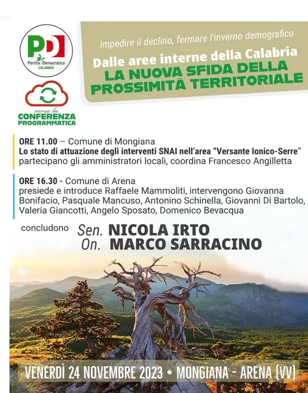 Nel pomeriggio alle ore 16,30, nella sala consiliare del Comune di Arena, dopo i saluti del circolo Pd con Giovanna Bonifacio e la relazione di Pasquale Mancuso, interverranno Antonio Schinella, Sindaco di Arena, Giovanni Di Bartolo, Segretario di Federazione, Valeria Giancotti, Direzione regionale, Angelo Sposato, Segretario Cgil Calabria, Domenico Bevacqua, Capogruppo Pd Calabria. Concluderanno il Senatore e segretario regionale del partito Nicola Irto e il deputato e componente della direzione nazionale dem Marco Sarracino. «Bisogna intervenire con la necessaria tempestività per affrontare la drammatica e preoccupante situazione economica, sociale e culturale che si vive in queste realtà – afferma Mammoliti – che si traduce in un effettivo indebolimento dei servizi essenziali quali mobilità, salute, istruzione. In questi anni si sono consumate tante riflessioni su questo tema, nonostante questo si corre il reale rischio che il processo di avanzamento nell’utilizzo proficuo delle risorse possa subire un pericoloso rallentamento, alla luce delle norme contenute nel Decreto Sud che, piuttosto che accelerare la spesa, la centralizza attraverso l’istituzione di una cabina di regia presso la Presidenza del Consiglio dei Ministri, il tutto in netta contraddizione rispetto alla tanto declamata autonomia differenziata. Proprio per assumere, definire e concretizzare percorsi operativi – prosegue il consigliere regionale -, considero l’organizzazione di tale iniziativa fondamentale ed indispensabile per tentare di fermare lo spopolamento del territorio e, allo stesso tempo, indispensabile per garantire alle Comunità che vivono nelle aree interne reddito e servizi adeguati. È un impegno categorico a cui nessuno degli attori coinvolti si può e si deve sottrarre.In tale direzione sarà elaborato un contributo per la conferenza programmatica del Pd, prevista per il mese di gennaio 2024. Anche per questa via, sono convinto, si potrà garantire nel territorio più negletto della Calabria, l’affermazione dei diritti di cittadinanza e della legalità, condizione imprescindibile – conclude Mammoliti – per garantire tenuta democratica, crescita civile e sviluppo produttivo».