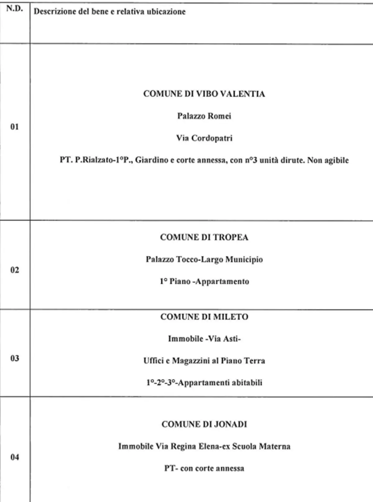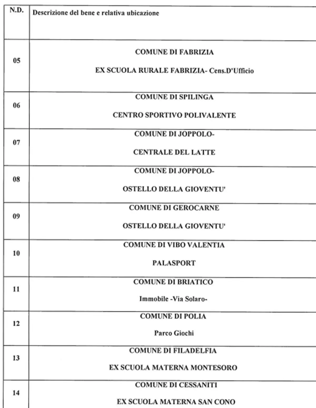 La Provincia di Vibo Valentia, dunque, prova a fare cassa ed a disfarsi di parte del proprio patrimonio immobiliare divenuto in molti casi ingestibile per costi di manutenzione, pulizia e gestione. Il Piano delle alienazioni e delle valorizzazioni previsto del 2021 e in maniera prospettica per il 2022 ed il 2023 tiene altresì conto di forma di valorizzazione alternative all’alienazione, da conseguire in considerazione dell’andamento del mercato immobiliare anche nelle more della dismissione dei relativi cespiti. Ecco in basso l’elenco dei beni immobili che la Provincia intende alienare.