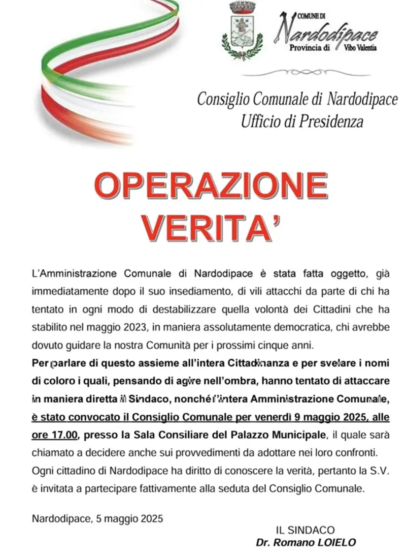 Anche il “manifesto” a firma del sindaco di Nardodipace, Romano Loielo, datato 5 maggio 2025, non è da meno. Nello stesso si legge infatti: “Operazione Verità. L’amministrazione comunale di Nardodipace è stata fatta oggetto, già immediatamente dopo il suo insediamento, di vili attacchi da parte di chi ha tentato in ogni modo di destabilizzare quella volontà dei cittadini che ha stabilito nel maggio 2023, in maniera assolutamente democratica, chi avrebbe dovuto guidare la nostra comunità per i prossimi cinque anni. Per parlare di questo insieme all’intera cittadinanza e per svelare i nomi di coloro i quali, pensando di agire nell’ombra, hanno tentato di attaccare in maniera diretta il sindaco, nonché l’intera amministrazione comunale, è stato convocato il Consiglio comunale per Venerdì 9 maggio 2025 alle ore 17:00 presso la sala consiliare del palazzo municipale, il quale sarà chiamato a decidere anche sui provvedimenti da adottare nei loro confronti. Ogni cittadino di Nardodipace ha diritto di conoscere la verità, pertanto la S.V. è invitata a partecipare fattivamente alla seduta del Consiglio comunale”. Firmato: Romano Loielo, sindaco di Nardodipace.