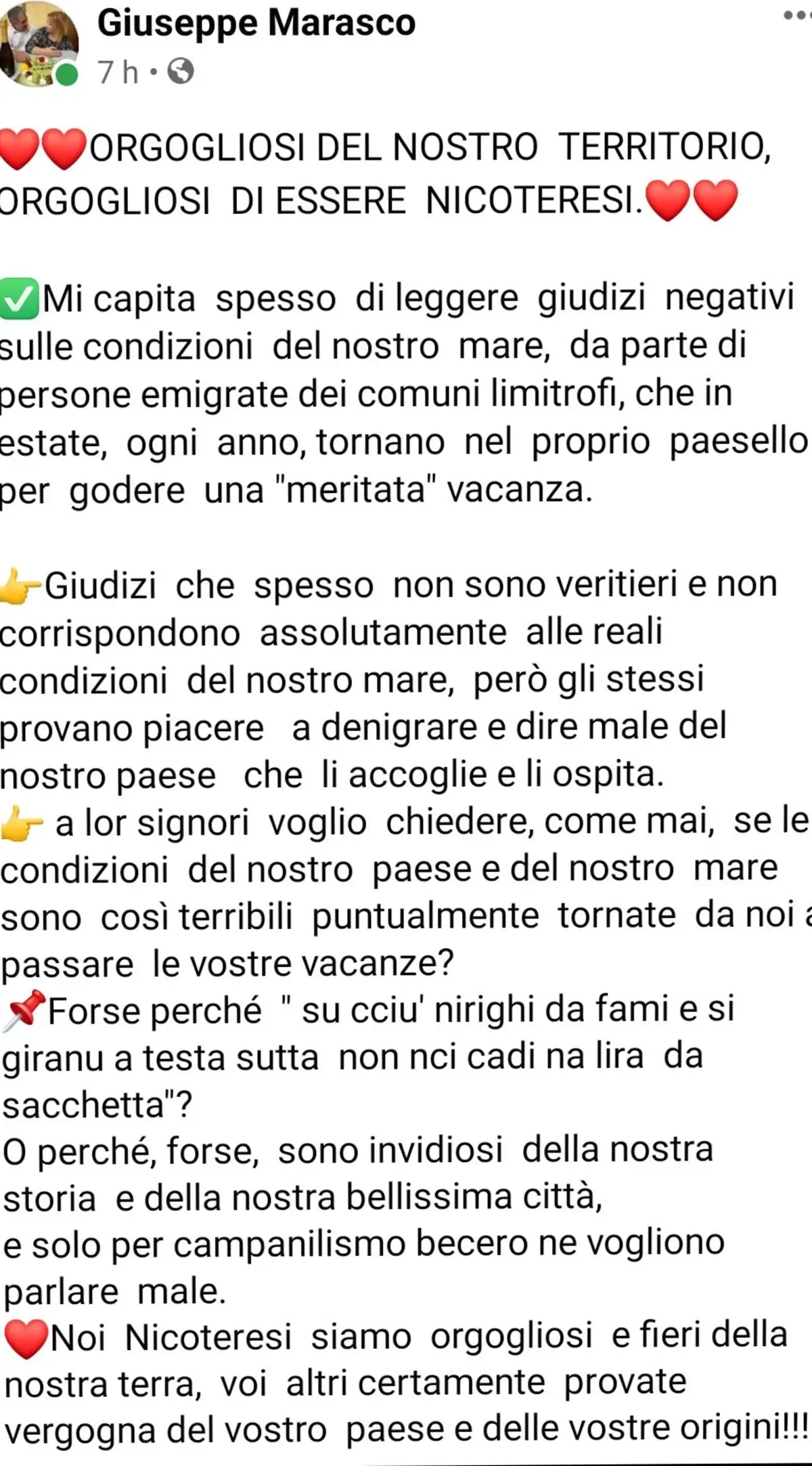La segretaria comunale Carmen Zagari e il consigliere Antonio Macrì, «in qualità prima di cittadini e poi di militanti della Lega Salvini Premier di Nicotera», esprimono tutto il loro «dispiacere e disapprovazione nei confronti del nostro sindaco Pino Marasco. Quest’ultimo con la sua citazione “su cciu’ nirighi da fami e si giranu a testa sutta non nci cadi na lira da sacchetta” pubblicata sul suo profilo Facebook ha evidentemente sollevato, anziché un senso di appartenenza e di orgoglio nei confronti dei suoi conterranei, un messaggio indelicato e poco rispettoso con chi, spesso costretto a malincuore a lasciare la propria terra per esigenze lavorative sperando in un futuro migliore per sé e per i propri figli, si ritrova a doversi sentire mortificato proprio da chi, prima da concittadino e poi da sindaco, dovrebbe accogliere sempre e comunque a braccia aperte, tutti coloro che nonostante tutto, amano e continuano ad amare Nicotera». [Continua in basso]