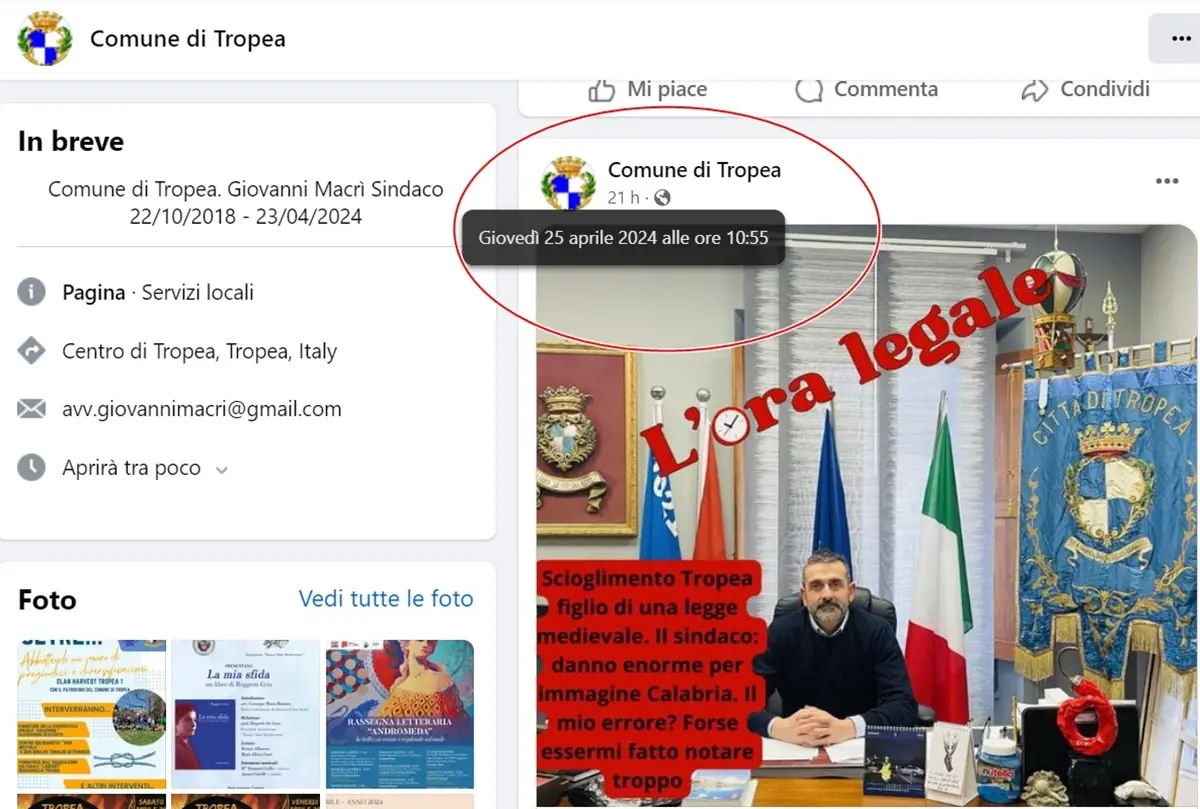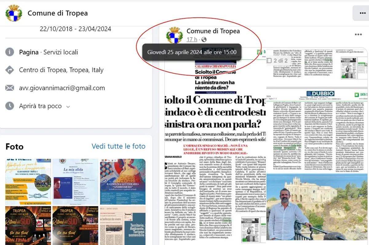 Polemiche a Tropea per l’utilizzo di una pagina Facebook creata a suo tempo dal sindaco Giovanni Macrì con la dicitura ed il logo del “Comune di Tropea”. Diverse ieri le segnalazioni (anche alla Prefettura di Vibo) sull’utilizzo che l’ex primo cittadino continuava a fare di tale pagina postando articoli di stampa a lui favorevoli (critici anche verso l’operato del procuratore Nicola Gratteri come i pezzi di Tiziana Maiolo su Il Dubbio) e tutti contro lo scioglimento della sua amministrazione per infiltrazioni mafiose. Alla fine la dicitura “Comune di Tropea” è ieri sparita e la pagina Facebook è stata trasformata in “Tropea Libera”, sempre gestita dall’ex primo cittadino e con foto ora proprio di Giovanni Macrì nel profilo. “Come se La Russa decidesse di punto in bianco di modificare la pagina social o sito del Senato a suo piacimento, sostituendo anche lo stemma con una sua foto. Alle varie associazioni turistiche e non – scrive un utente su Facebook – consiglio di pensare al danno d’immagine che tutte queste azioni porteranno, visto che di punto in bianco un turista va a ricercare la pagina del Comune per trovare informazioni o eventi e si ritrova invece Tropea Libera con tutti gli ultimi post che non danno una bella prospettiva”. [GUARDA FOTO IN BASSO]