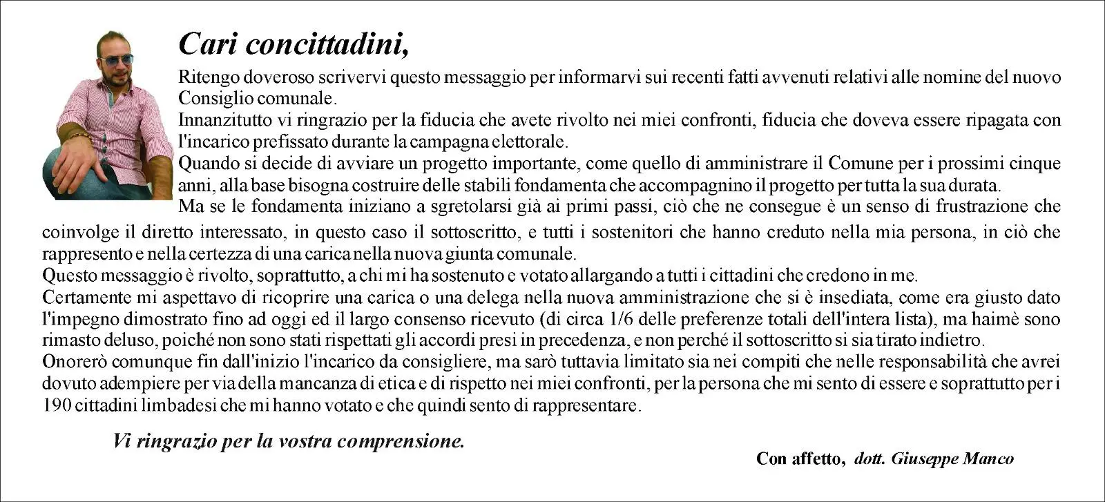 Neanche il tempo di insediarsi e di celebrare il primo Consiglio comunale alla presenza, fra gli altri del prefetto di Vibo Valentia, Francesco Zito, che a Limbadi “scoppia” il primo caso politico. Il neo consigliere comunale di maggioranza Giuseppe Manco, al quale il nuovo sindaco Pantaleone Mercuri ha affidato la delega agli Spettacoli (al pari di altri consiglieri di maggioranza a cui ha affidato altre singole deleghe) – coinvolgendo così nella vita amministrativa dell’ente locale tutti i consiglieri – non ci sta e per esprimere il proprio disappunto si affida a tanto di missiva e “manifesto” inviato a diversi cittadini-elettori di Limbadi. Una “comunicazione” che riproduciamo integralmente.