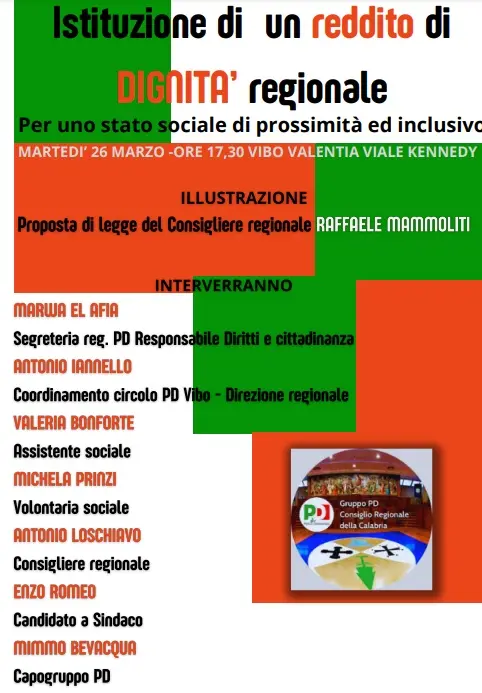 «Una misura messa in discussione dalla legge di bilancio 2023 prima e dalla conversione in legge del decreto lavoro dopo, che hanno sancito l’abrogazione del reddito di cittadinanza introducendo il criterio della cosiddetta “occupabilità” dei componenti del nucleo familiare e superando il principio dell’universalità che dovrebbe essere un tratto tipico per una misura di welfare presente in tutti i paesi dell’Unione Europea. Le condizioni di fragilità economica e sociale della città di Vibo e dell’intero territorio calabrese – aggiunge Mammoliti – richiedono provvedimenti appropriati per garantire un reddito di dignità universale e per uno stato sociale di prossimità e inclusivo». In tale direzione si terrà martedì 26 marzo alle 17.30 a Vibo Valentia un confronto con il candidato a sindaco Enzo Romeo. Illustrerà la proposta di legge il consigliere proponente Raffaele Mammoliti. Interverranno inoltre: Marwa El Afia, segreteria regionale Pd, responsabile Diritti e Cittadinanza; Antonio Iannello, coordinamento circolo Pd Vibo Valentia – Direzione regionale Pd; Valeria Bonforte, assistente sociale; Michela Prinzi, volontaria sociale; Antonio Lo Schiavo, consigliere regionale. Concluderà i lavori Mimmo Bevacqua, capogruppo in Consiglio regionale del Pd.