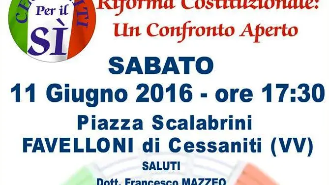 Per queste ragioni, sabato 11 giugno, alle 17.30, a Favelloni di Cessaniti, in Piazza Scalabrini, si terrà un incontro pubblico con i cittadini e alla presenza di due costituzionalisti: Carlo Fusaro dell’Università di Firenze, a favore del “SI”, e Alessandro Mazzitelli, dell’Università della Calabria a favore del “NO”.