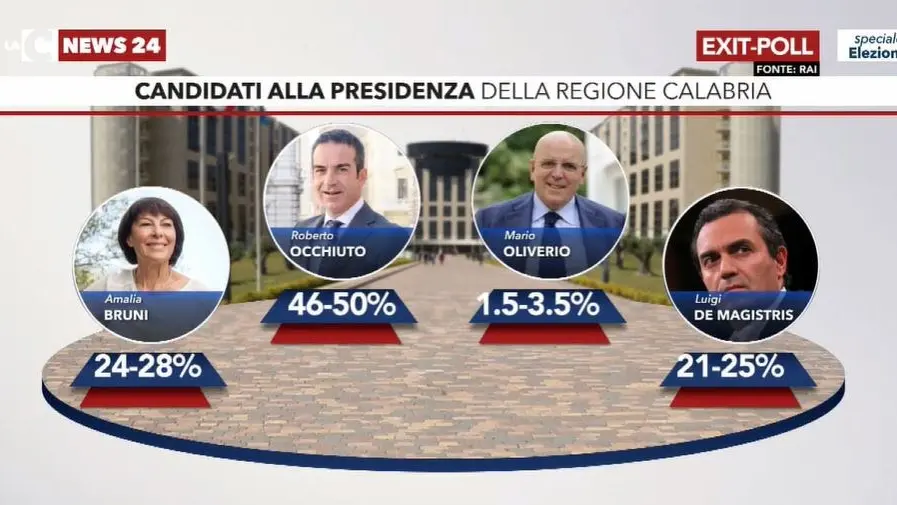 In base al primo Exit poll del consorzio Opinio Italia per la Rai, alle regionali in Calabria il candidato Roberto Occhiuto (centrodestra) raggiunge una forchetta del 46,5-50.5%, seguito da Amalia Cecilia Bruni (centrosinistra) con il 24-28%; al terzo posto Luigi de Magistris con 21-25%, Oliverio 1,5-3,5%.