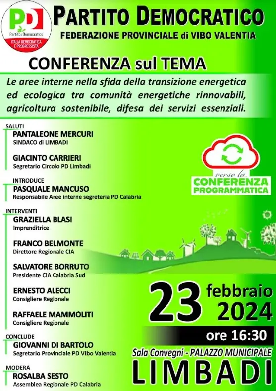 È questo il tema della Conferenza che la Federazione provinciale del Pd di Vibo Valentia ha organizzato, con il Circolo del Partito democratico di Limbadi, per venerdì 23 febbraio 2024, alle ore 16.30 alla sala convegni del palazzo municipale di Limbadi. L’iniziativa è inscritta nel percorso che vede impegnato il Pd della Calabria verso la convocazione della conferenza regionale programmatica. Dopo i saluti del sindaco di Limbadi, Pantaleone Mercuri e del segretario del Circolo del Pd locale Giacinto Carrieri, sarà Pasquale Mancuso, responsabile aree interne della Segreteria regionale del Pd, ad introdurre i lavori; seguiranno gli interventi di Graziella Blasi, imprenditrice, Franco Belmonte, direttore regionale Cia, Salvatore Borruto, presidente Cia Calabria Sud. Sono previsti anche gli interventi dei consiglieri regionali Raffaele Mammoliti ed Ernesto Alecci; a concludere l’iniziativa l’intervento del segretario provinciale del Pd di Vibo Valentia Giovanni Di Bartolo. A moderare i lavori Rosalba Sesto, componente dell’Assemblea regionale del Pd. “L’ iniziativa che abbiamo assunto insieme al Circolo partito democratico di Limbadi – afferma il segretario provinciale Pd Giovanni Di Bartolo – ha come obiettivo la riconnessione forte con le nostre aree interne, con il mondo agricolo e con la necessaria modernizzazione energetica e nel segno della piena sostenibilità eco-ambientale. Occorre, infatti, che la nostra comunità politica riprenda a dialogare con le istanze più avvertite delle popolazioni dei nostri Comuni, che sono per la stragrande maggioranza comunità periferiche e marginali, per difendere, innanzitutto, quei servizi essenziali, a cominciare dall’Istruzione, alla Sanità di prossimità, alla mobilità, senza i quali non è possibile ipotizzare qualsiasi ipotesi di sviluppo e di resilienza. E non è senza significato che questa iniziativa sia inserita nel percorso di avvicinamento alla ormai prossima celebrazione della Conferenza regionale programmatica che segnerà positivamente lo sforzo di rigenerazione del Partito portato avanti dal segretario regionale senatore Nicola Irto”.