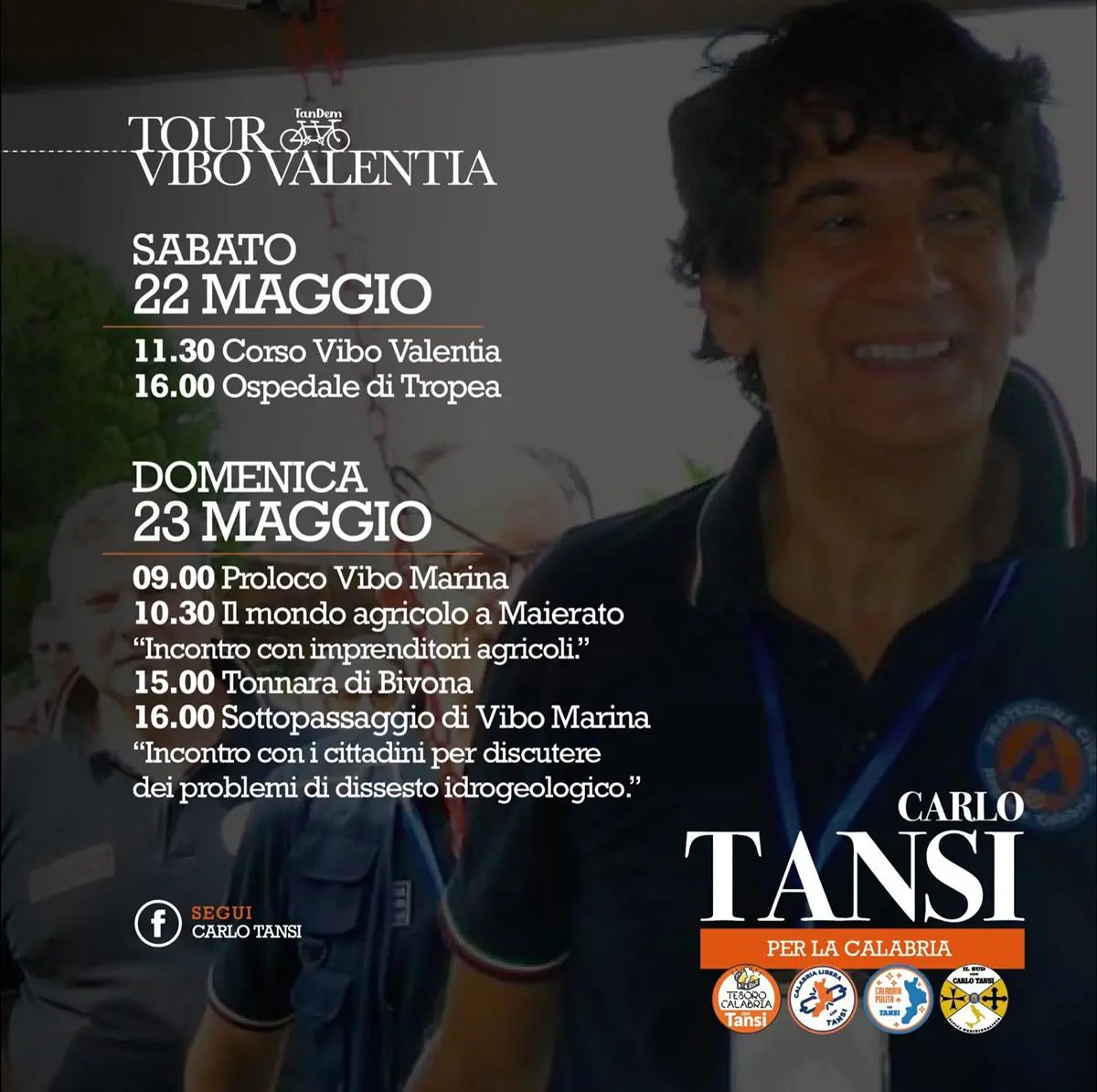Nella giornata di domenica alle ore 9.00 Carlo Tansi sarà nella sede della Proloco di Vibo Marina. Seguirà alle ore 10.30 un incontro a Maierato con alcuni imprenditori agricoli afflitti dalla grave crisi del settore. Alle ore 15.00 Carlo Tansi si sposterà alla Tonnara di Bivona, mentre alle ore 16.00 effettuerà un sopralluogo presso il sottopassaggio di Vibo per denunciare le criticità irrisolte di questo ambito territoriale e per discutere dei problemi di dissesto idrogeologico che fanno della città di Vibo uno dei territori, in Italia, più esposti ai rischi naturali. “Ai tempi in cui dirigevo la Prociv – ha affermato Tansi – ho fatto in modo di assegnare al Comune quasi 12 milioni di euro per risolvere gran parte dei problemi del dissesto idrogeologico che però giacciono, ancora oggi, nei cassetti dei burocrati regionali e da oltre tre anni non sono stati spesi”.