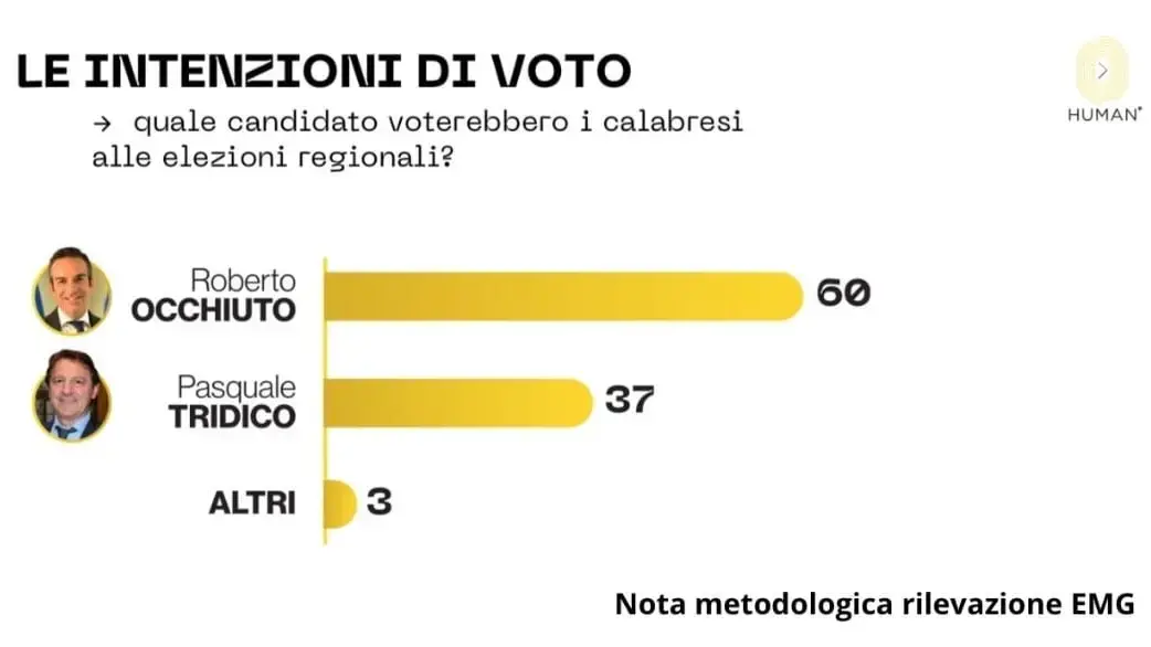 E poi: «La società di questo sondaggio, la EMG, ha ricevuto nell’ultimo anno 50.000 euro dalla Regione Calabria del Presidente Occhiuto per l’’Affidamento servizio sondaggi su temi di interesse dell’amministrazione’, come da decreti 9332 e 11125 entrambi di luglio 2024. Tutto normale?».