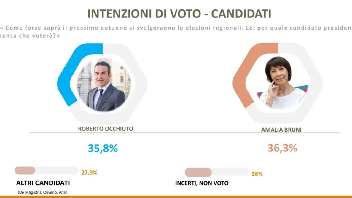 Contrariamente a quella che è maggioranza dei commenti politici, in Calabria, impegnata al voto per il rinnovo del consiglio regionale i prossimi 3 e 4 ottobre, nella partita per la presidenza sarebbe testa a testa tra Roberto Occhiuto (35,8%) e Amalia Bruni (36,3%). La rilevazione arriva dal sondaggio realizzato da Winpoll per Scenari politici, nel periodo tra il 30 luglio e il 4 agosto sulla popolazione calabrese dai 18 anni in su (metodo ponderato per genere, fasce di età, categoria socio professionale ed intenzioni di voto alle ultime europee) e si basa su un campione di 1300 interviste completate 6314 rifiuti. [Continua in basso]