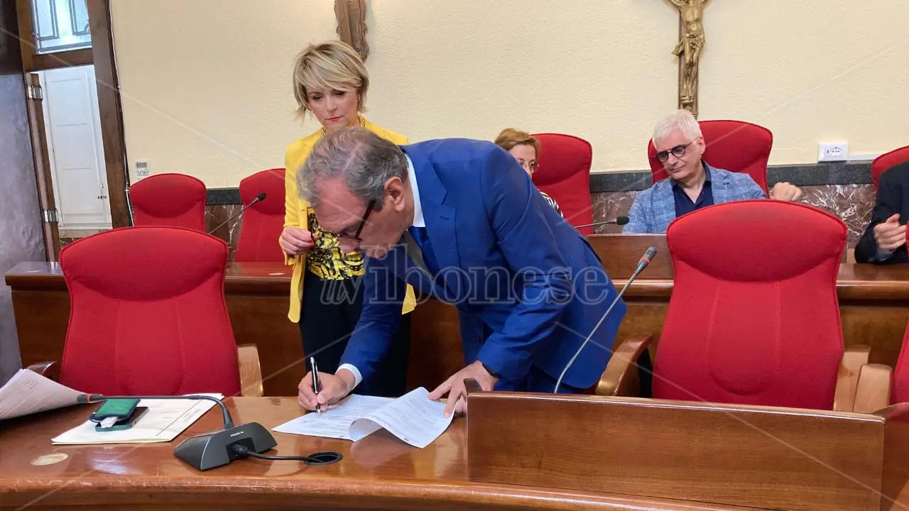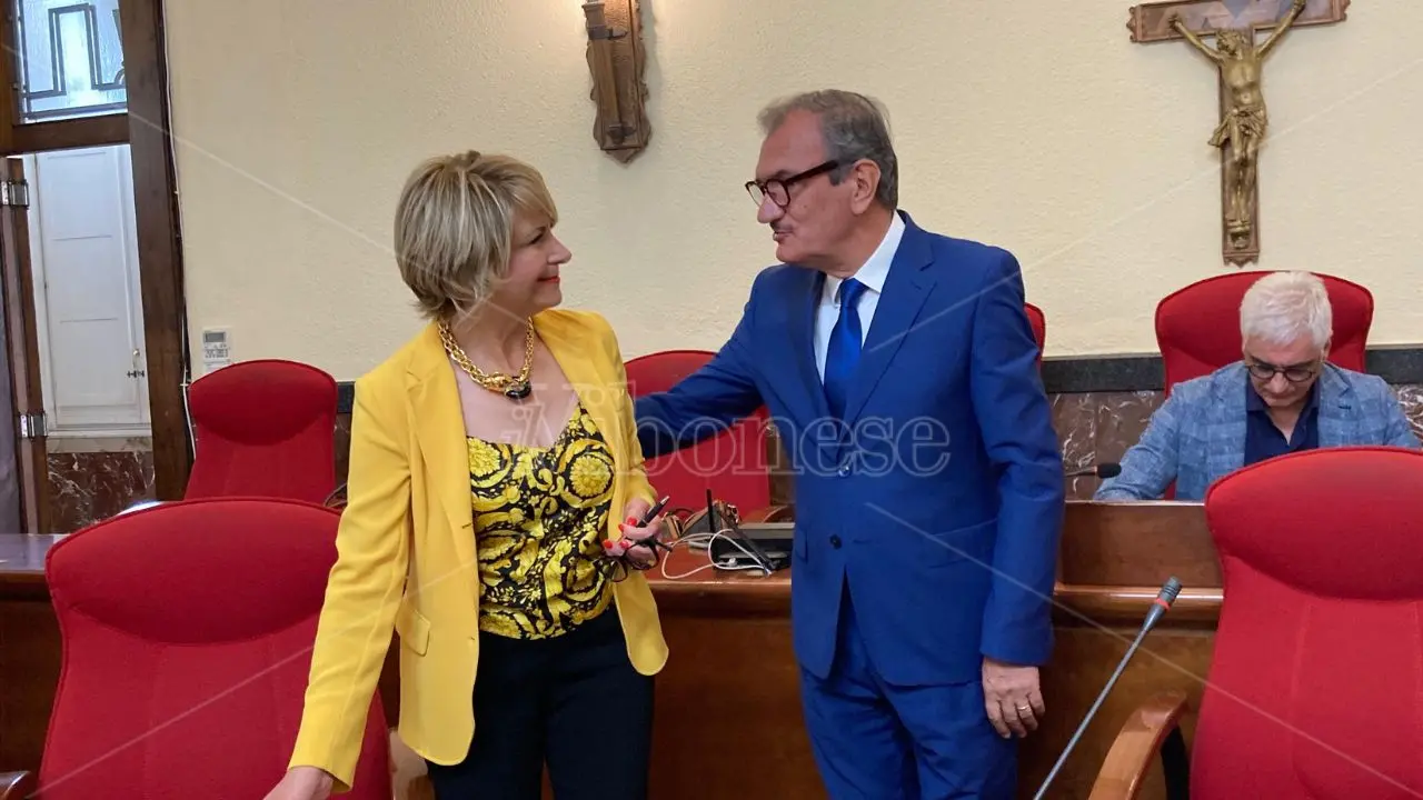 Quello tra il sindaco uscente Maria Limardo e il nuovo primo cittadino di Vibo Valentia, Enzo Romeo, è stato un passaggio di consegne cordiale, senza eccessi, senza parole sopra le righe di un adempimento formale, certo, ma anche carico di emozioni per chi lasciava il Municipio e per chi prendeva il suo posto. Romeo, in completo blu elettrico, Limardo con un’elegante giacca gialla (affiancati facevano un involontario effetto pro-Ucraina), hanno firmato oggi i documenti in sala consiliare, alla presenza di numerosi neo consiglieri e giornalisti, in un silenzio quasi imbarazzato rotto solo dall’appaluso finale seguito da poche parole di Romeo, che ha ringraziato il sindaco uscente «pur tutto quello che ha fatto». «Ora ti potrai riposare», ha detto rivolto a Limardo, che si è limitata a sorridere e scandire qualche «bene, bene», desiderosa probabilmente di chiudere la pratica e uscire di scena in fretta. Poi il nuovo sindaco si è concesso ai microfoni e ai taccuini dei giornalisti, sottolineando innanzitutto l’emozione del momento.